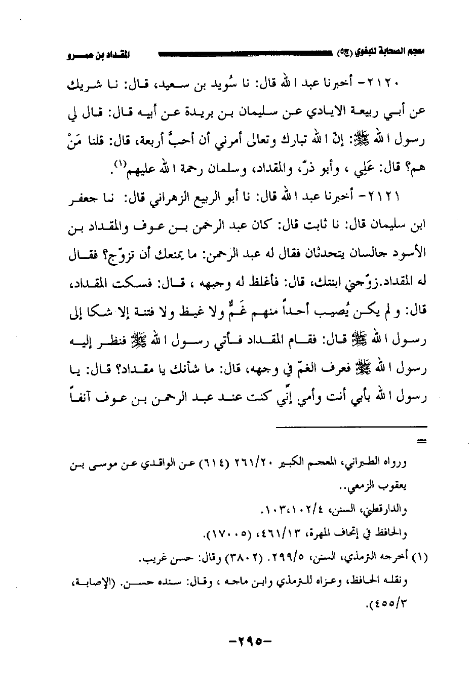 ٢١٢١ - أخبرنا عبد الله قال: حدثنا أبو الربيع الزهراني قال: حدثنا جعفر بن سليمان قال: حدثنا ثابت قال كان عبد الرحمن بن عوف والمقداد بن الأسود جالسان يتحدثان فقال له عبد الرحمن ما يمنعك أن تزوج فقال له المقداد زوجني ابنتك قال فأغلظ له وجبهه قال فسكت المقداد قال ولم يكن يصيب أحد منهم غم ولا غيظ ولا فتنة إلا شكا إلى رسول الله صلى الله عليه وسلم قال: فقام المقداد فأتى رسول الله صلى الله عليه وسلم فنظر إليه رسول الله صلى الله عليه وسلم فعرف الغم في وجهه قال ما شأنك يا مقداد قال يا رسول الله بأبي أنت وأمي إني كنت عند عبد الرحمن بن عوف آنفا
