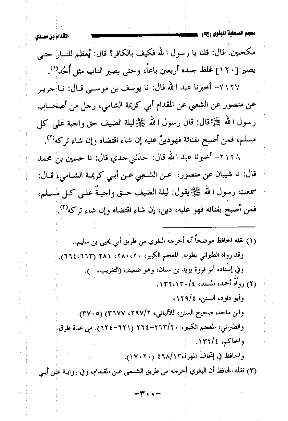 ٢١٢٨ - أخبرنا عبد الله قال: حدثني جدي قال: حدثنا حسين بن محمد قال: حدثنا شيبان عن منصور عن الشعبي عن أبي كريمة الشامي قال: سمعت رسول الله صلى الله عليه وسلم يقول: ليلة الضيف حق واجبة على كل مسلم فمن أصبح بفنائه فهو عليه دين إن شاء اقتضاه وإن شاء تركه.