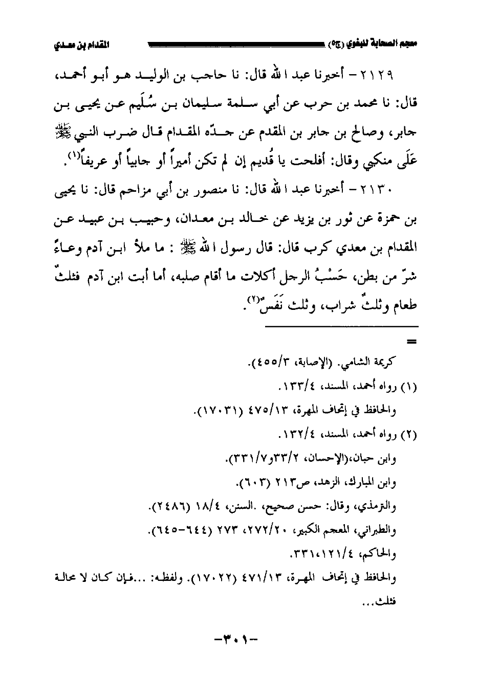 ٢١٣٠ - أخبرنا عبد الله قال: حدثنا منصور بن أبي مزاحم قال: حدثنا يحيى بن حمزة عن ثور بن يزيد عن خالد بن معدان وحبيب بن عبيد عن المقدام بن معدي كرب قال: قال رسول الله صلى الله عليه وسلم ما ملأ ابن آدم وعاء شر من بطن حسب الرجل أكلات ما أقام صلبه أما أبت ابن آدم فثلث طعام وثلث شراب وثلث نفس.