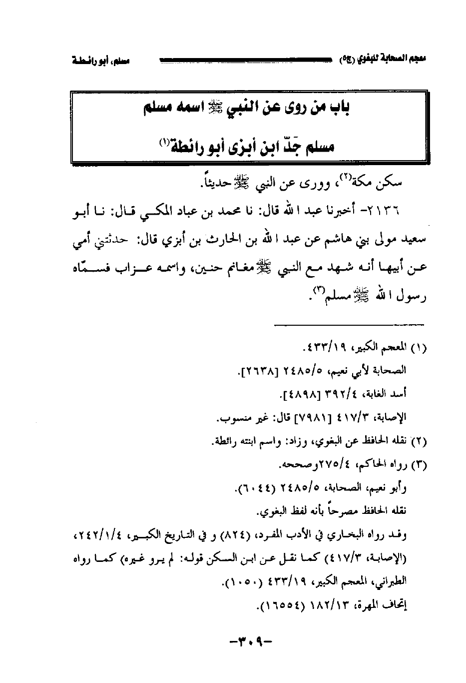 ٢١٣٦ - أخبرنا عبد الله قال: حدثنا محمد بن عباد المكي قال: حدثنا سعيد مولى بني هاشم عن عبد الله بن الحارث بن أبزى قال حدثتني أمي عن أبيها أنه شهد مع النبي صلى الله عليه وسلم مغانم حنين واسمه عزاب فسماه رسول الله صلى الله عليه وسلم مسلم.