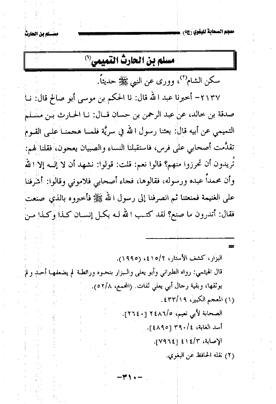 ٢١٣٧ - أخبرنا عبد الله قال: حدثنا الحكم بن موسى أبو صالح قال: حدثنا صدقة بن خالد عن عبد الرحمن بن حسان قال: حدثنا الحارث بن مسلم التميمي , عن أبيه قال بعثنا رسول الله صلى الله عليه وسلم في سرية فلما هجمنا على القوم تقدمت أصحابي على فرس فاستقبلنا النساء والصبيان يعجون فقلنا لهم تريدون أن تحرزوا منهم قالوا نعم قلت قولوا نشهد أن لا إله إلا الله وأن محمدا عبده ورسوله فقالوها فجاء أصحابي فلاموني وقالوا أشرفنا على الغنيمة فمنتعتنا ثم انصرفنا إلى رسول الله صلى الله عليه وسلم فأخبروه بالذي صنعت فقال أتدرون ما صنع لقد كتب رالله له بكل إنسان كذا وكذا من
