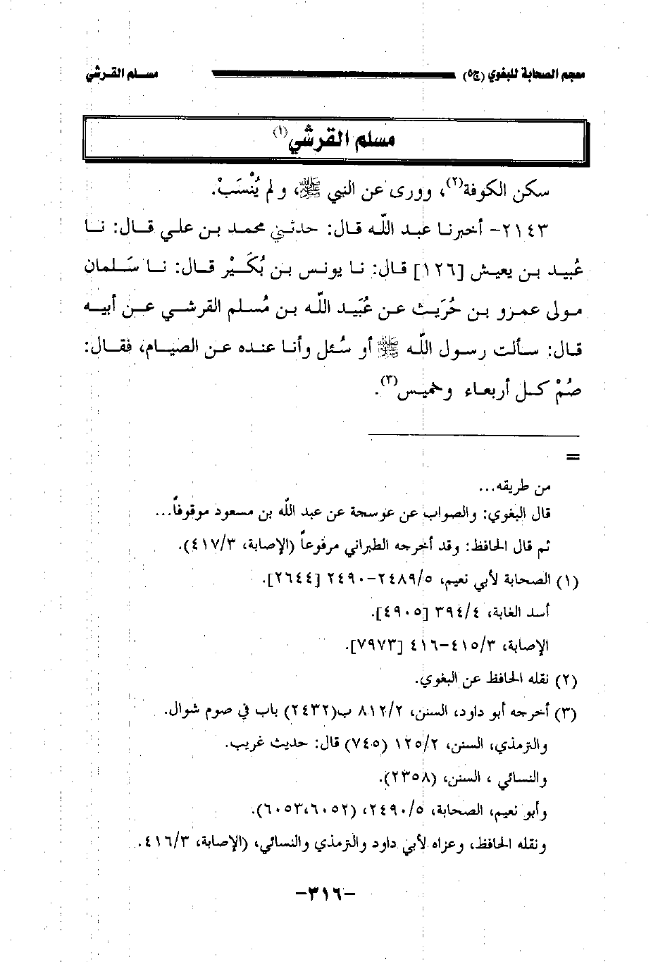 ٢١٤٣ - أخبرنا عبد الله قال: حدثني محمد بن علي قال: حدثنا عبيد بن يعيش //١٢٦// قال: حدثنا يونس بن بكير قال: حدثنا سلمان مولى عمرو بن حريث عن عبيد الله بن مسلم القرشي , عن أبيه قال سألت رسول الله صلى الله عليه وسلم أو سئل وأنا عنده عن الصيام فقال صم كل أربعاء وخميس.