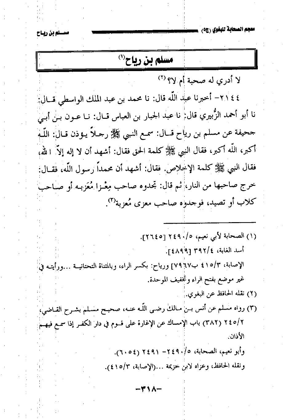 ٢١٤٤ - أخبرنا عبد الله قال: حدثنا محمد بن عبد الملك الواسطي قال: حدثنا أبو أحمد الزبيري قال: حدثنا عبد الجبار بن العباس قال: حدثنا عون بن أبي جحيفة عن مسلم بن رياح قال سمع النبي صلى الله عليه وسلم رجلا يؤذن قال الله أكبر الله أكبر فقال النبي صلى الله عليه وسلم كلمة الحق فقال أشهد أن لا إله إلا الله فقال النبي صلى الله عليه وسلم كلمة الإخلاص فقال أشهد أن محمدا رسول الله فقال خرج صاحبها من النار , ثم قال: تجدوه صاحب معزا أو صاحب كلاب تصيد فوجدوه صاحب معزى معزبة.