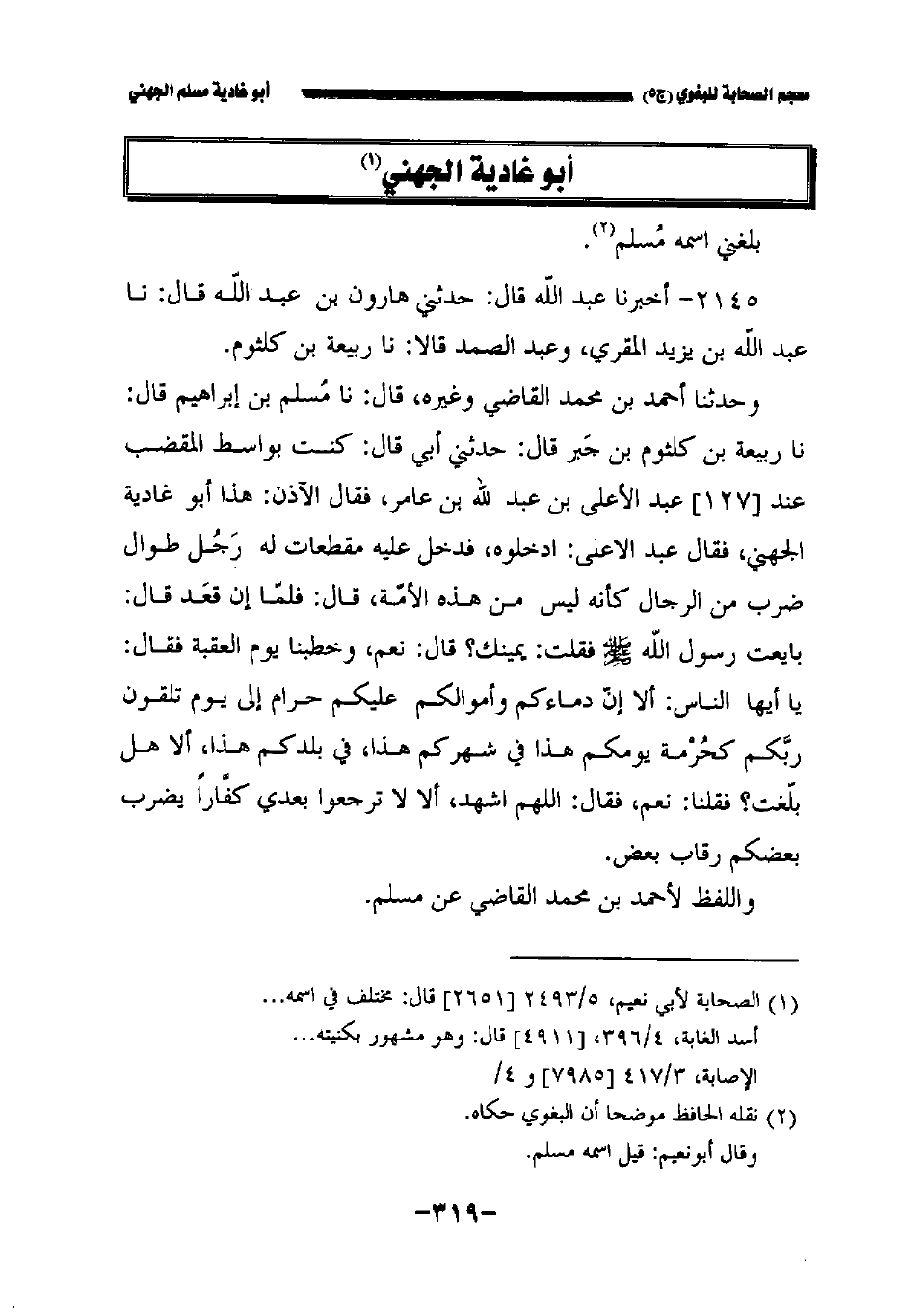 وحدثنا أحمد بن محمد القاضي وغيره قال: حدثنا مسلم بن إبراهيم قال: حدثنا ربيعة بن كلثوم بن جبر قال: حدثني أبي قال كنت بواسط المقضب عند //١٢٧//عبد الأعلى بن عبد الله بن عامر فقال الآذان هذا أبو غادية الجهني فقال عبد الأعلى ادخلوه فدخل عليه مقطعات له رجل طوال ضرب من الرجال كأنه ليس من هذه الأمة قال فلما إن قعد قال بايعت رسول الله صلى الله عليه وسلم فقلت يمينك قال نعم وخطبنا يوم العقبة فقال يا أيها الناس ألا إن دماءكم وأموالكم عليكم حرام إلى يوم تلقون ربكم كحرمة يومكم هذا في شهركم هذا في بلدكم هذا ألا هل بلغت فقلنا نعم فقال اللهم اشهد الآ لا ترجعوا بعدي كفارا يضرب بعضكم رقاب بعض.