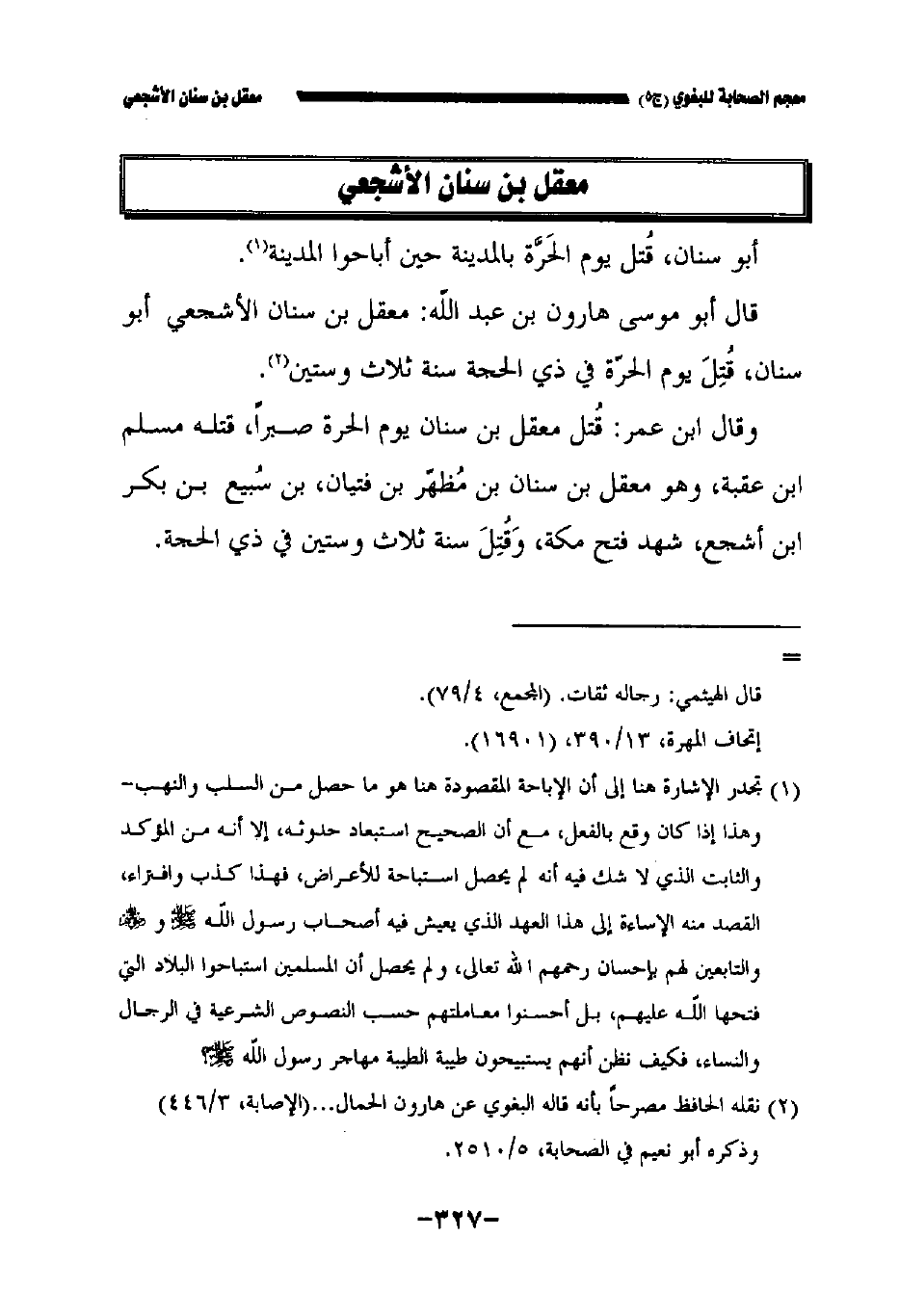 قال أبو موسى هارون بن عبد الله: معقل بن سنان الأشجعي أبو سنان قتل يوم الحرة في ذي الحجة سنة ثلاث وستين.