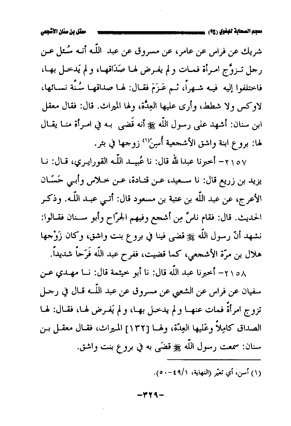٢١٥٨ - أخبرنا عبد الله قال: حدثنا أبو خيثمة قال: حدثنا مهدي عن سفيان عن فراس عن الشعبي عن مسروق عن نافع عن ابن عمر قال في رجل تزوج امراة فمات عنها ولم يدخل بها ولم يفرض لها فقال لها الصداق كاملا وعليها العدة ولها //١٣٢// الميراث فقال معقل بن سنان سمعت رسول الله صلى الله عليه وسلم قضى به في بروع بنت واشق.