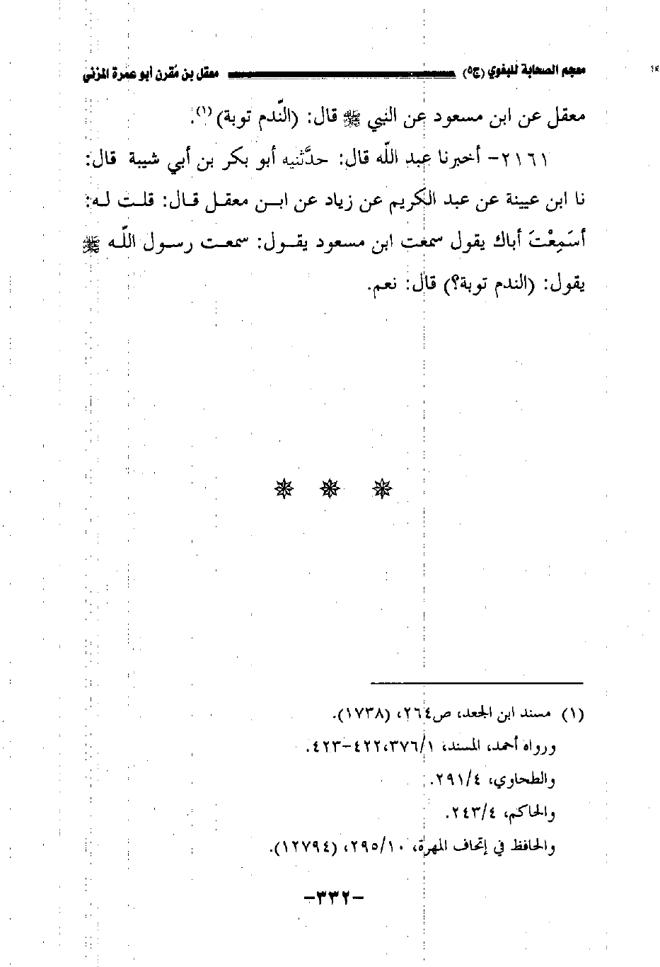 معقل عن ابن مسعود رضي الله عنه عن النبي صلى الله عليه وسلم قال: الندم توبة.