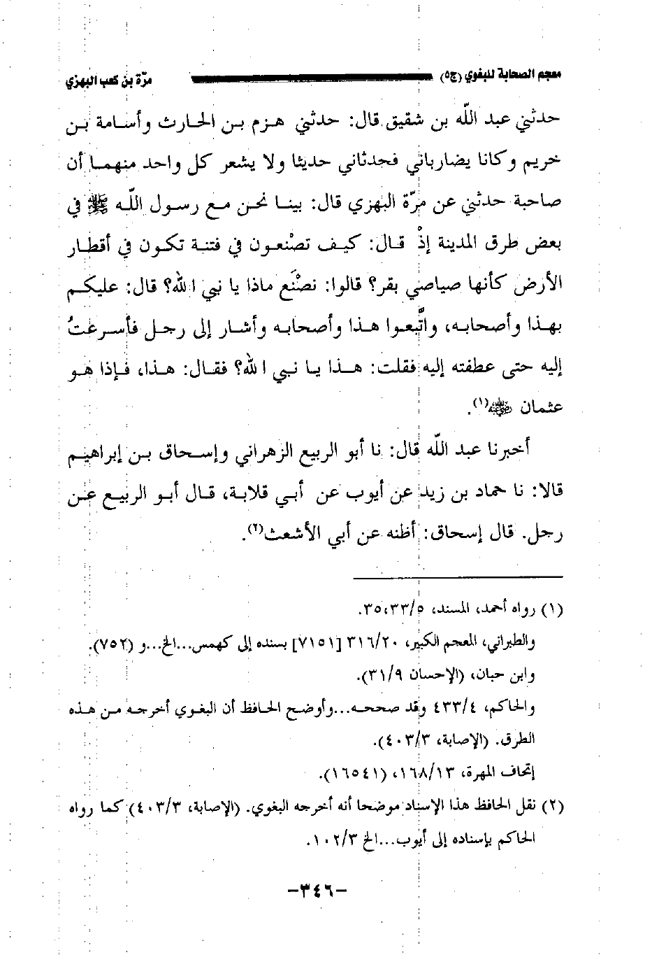 حدثني عبد الله بن شقيق قال: حدثني هزم بن الحارث وأسامة بن خريم وكانا يضارباني فحدثاني حديثا ولا يشعر كل واحد منهما أن صاحبه حدثني عن مرة البهزي قال بينا نحن مع رسول الله صلى الله عليه وسلم في بعض طرق المدينة إذ قال كيف تصنعون في فتنة تكون في أقطار الأرض كأنها صياصي بقر قالوا نصنع ماذا يا نبي الله قال عليكم بهذا وأصحابه واتبعوا هذا وأصحابه وأشار إلى رجل فأسرعت إليه حتى عطفته إليه فقلت هذا نبي الله فقال هذا , فإذا هو عثمان رضي الله عنه.