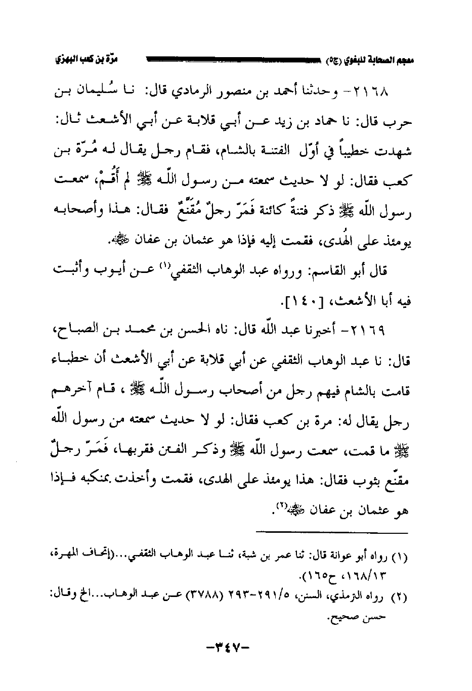 ٢١٦٩ - أخبرنا عبد الله قال: حدثناه الحسن بن محمد بن الصباح قال حدثنا عبد الوهاب الثقفي عن أبي قِلابَة , عن أبي الأشعث أن خطباء قامت بالشام فيهم رجل من أصحاب رسول الله صلى الله عليه وسلم قام آخرهم رجل يقال له مرة بن كعب فقال لولا حديث سمعته من رسول الله صلى الله عليه وسلم ما قمت سمعت رسول الله صلى الله عليه وسلم وذكر الفتن فقربها فمر رجل مقنع بثوب فقال هذا يومئذ على الهدى فقمت وأخذت بمنكبه , فإذا هو عثمان بن عفان رضي الله عنه.