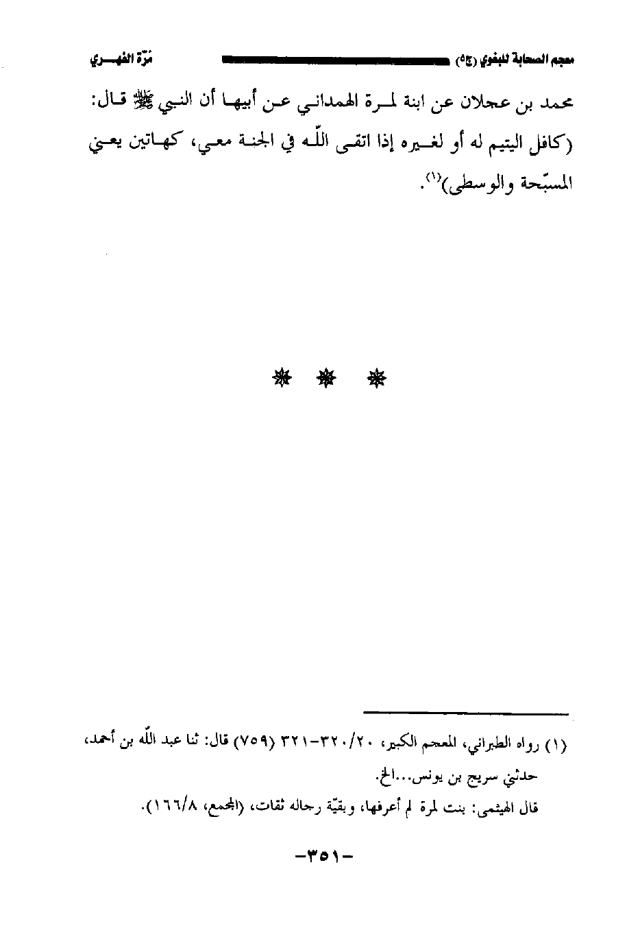 محمد بن عجلان عن ابنة لمرة الهمداني عن أبيها أن النبي صلى الله عليه وسلم قال: كافل اليتيم له أو لغيره إذا اتقى الله في الجنة معي كهاتين يعني المسبحة والوسطى.