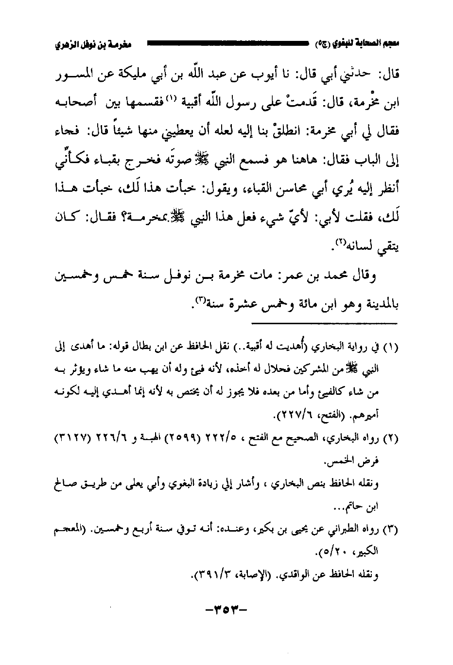 قال: حدثني أبي قال: حدثنا أيوب عن عبد الله بن أبي مليكة عن المسور بن مخرمة قال قدمت على رسول الله صلى الله عليه وسلم أقبية فقسمها بين أصحابه فقال لي أبي مخرمة انطلق بنا إليه لعله أن يعطيني منها شيئا قال جاء إلى الباب فقال هاهنا هو فسمع النبي صلى الله عليه وسلم صوته فخرج بقباء فكأني أنظر إليه يرى أبي محاسن القباء، ويقول: خبأت هذا لك، خبأت هذا لك، فقلت لأبي لأي شيء فعل هذا النبي صلى الله عليه وسلم بنخرمة فقال كان يتقي لسانه.