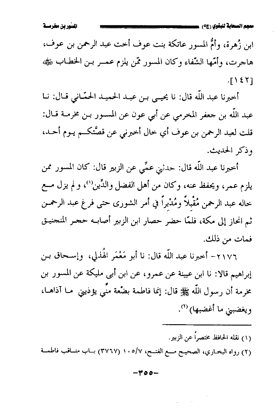 بن زهرة وام المسور عاتكة بنت عوف أخت عبد الرحمن بن عوف خاجرت وأمها الشفاء وكان المسور ممن يلزم عمر بن الخطاب رضي الله عنه.//١٤٢//