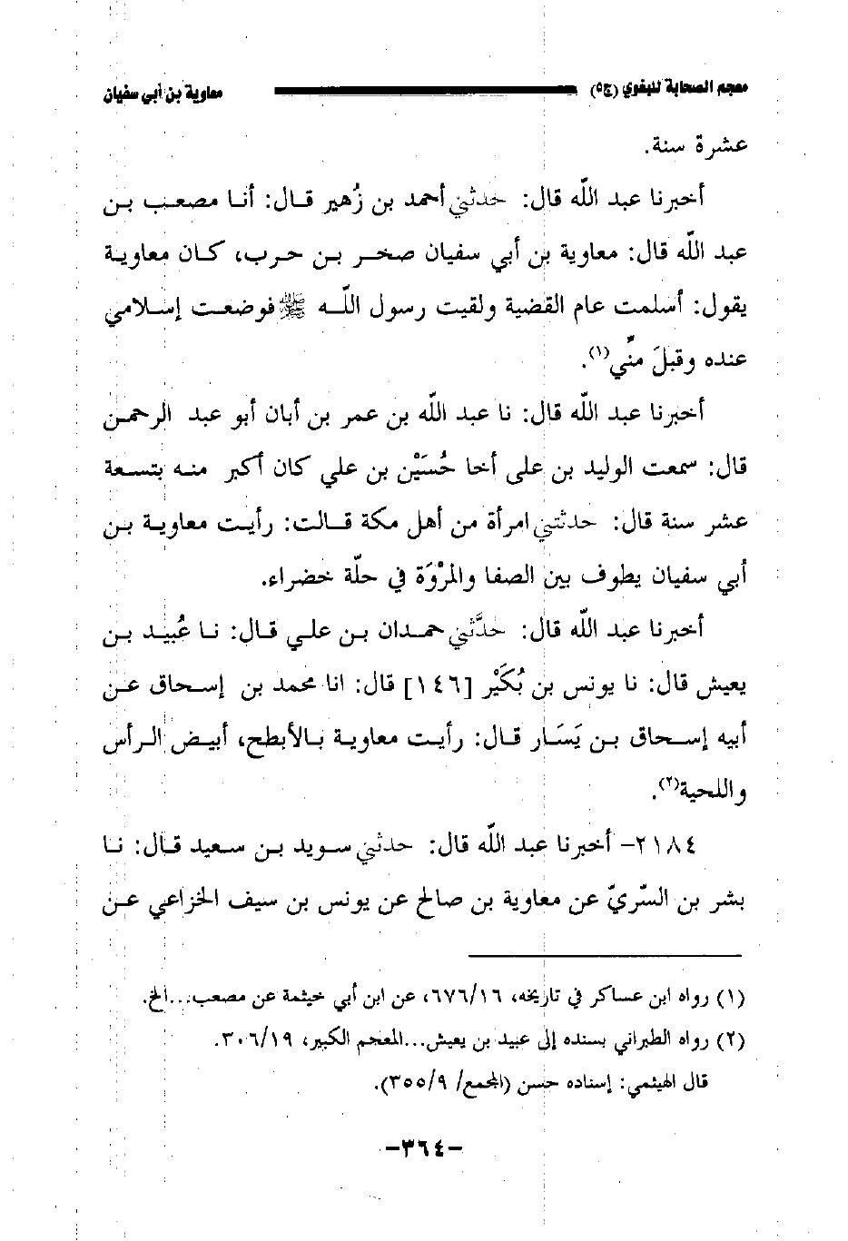 أخبرنا عبد الله قال: حدثني حمدان بن علي قال: حدثنا عبيد بن يعيش قال: حدثنا يونس بن بكير //١٤٦// قال: أخبرنا محمد بن إسحاق، عن أبيه إسحاق بن يسار، قال رأيت معاوية بالأبطح أبيض الرأس واللحية.