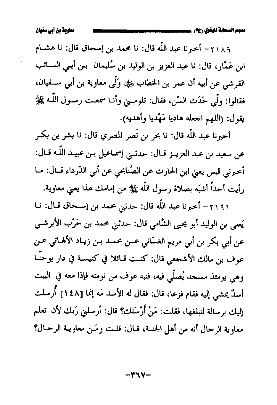 ٢١٩١ - أخبرنا عبد الله قال: حدثني محمد بن إسحاق قال: حدثنا يعلى بن الوليد أبو يحيى الشامي قال: حدثني محمد بن حرب الأبرشي عن أبي بكر بن أبي مريم الغساني عن محمد بن زياد الألهاني عن عوف بن مالك الأشجعي قال كنت قائلا في كنيسة في دار يوحنا وهي يومئذ مسجد يصلى فيه فنبه عوف من نومته , فإذا معه في البيت أسد يمشي إليه فقام فزعا قال فقال له الأسد مه إنما //١٤٨//أرسلت إليك برسالة لتبلغها فقلت من أرسلك قال أرسلني ربك لأن تعلم معاوية الرحال أنه من أهل الجنة قال قلت ومن معاوية الرحال؟