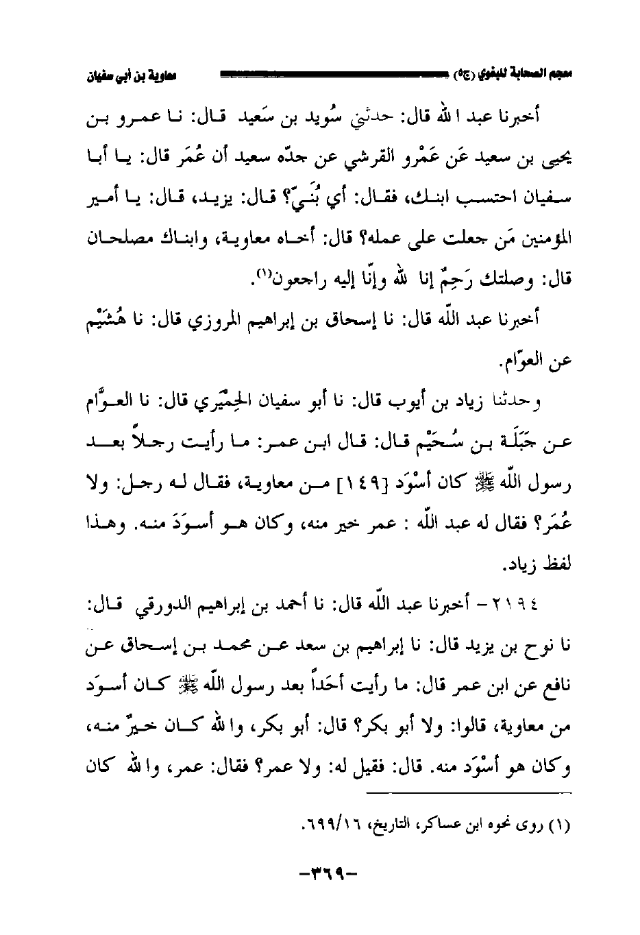 وحدثنا زياد بن أيوب قال: حدثنا أبو سفيان الحميري قال: حدثنا العوام عن جبلة بن سحيم قال: قال ابن عمر ما رأيت رجلا بعد رسول الله صلى الله عليه وسلم كان أسود //١٤٩// من معاوية فقال له رجل ولا عمر فقال له عبد الله: عمر خير منه وكان أسود منه.
