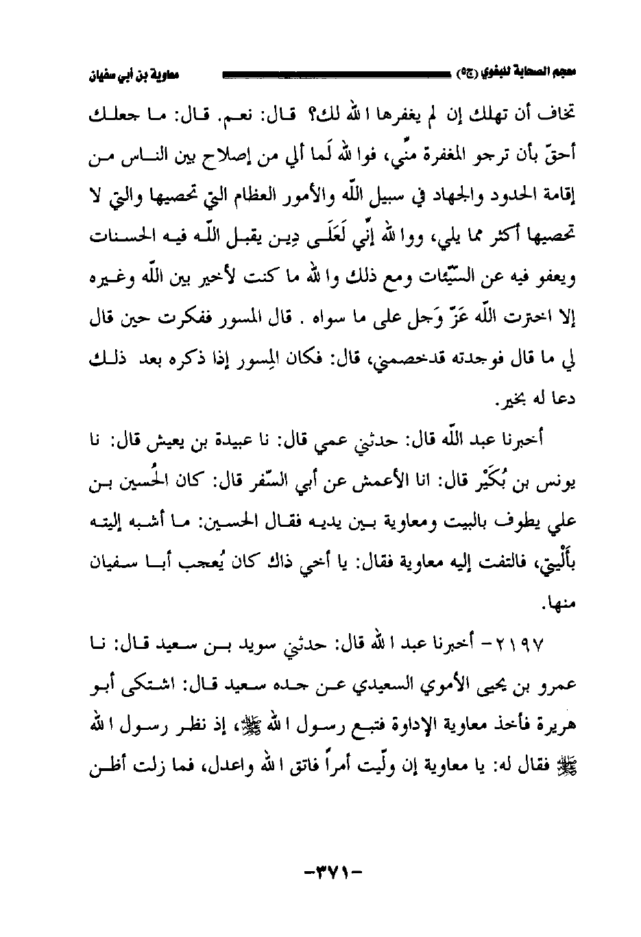 أخبرنا عبد الله قال: حدثني عمي قال: حدثنا عبيدة بن يعيش قال: حدثنا يونس بن بكير قال: أخبرنا الأعمش , عن أبي السفر قال كان الحسين بن علي يطوف بالبيت ومعاوية بين يديه فقال الحسين ما أشبه إليته بأليتي فالتفت إليه معاوية فقال يا أخي ذاك كان يعجب أبا سفيان منها.