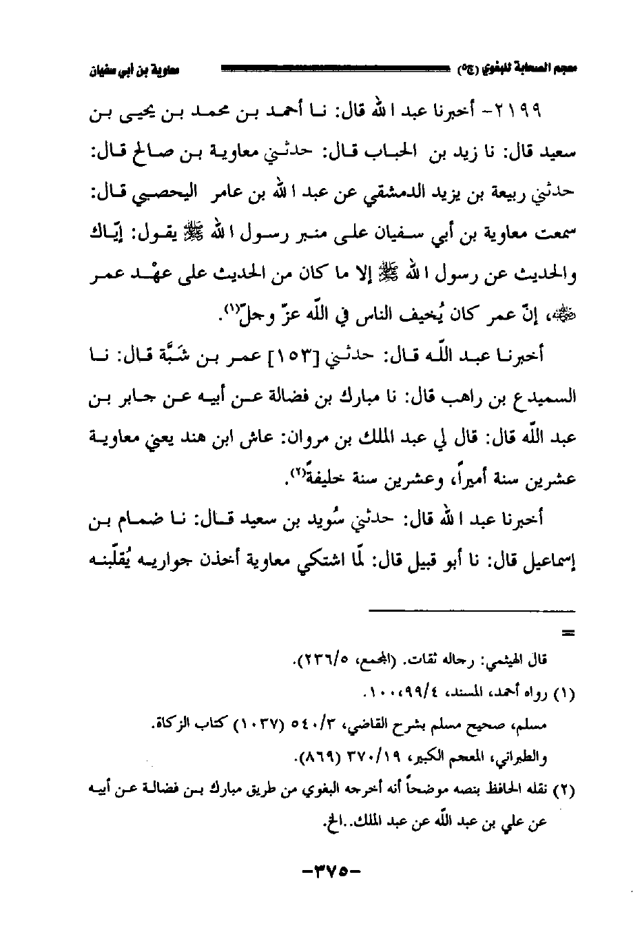 ٢١٩٩ - أخبرنا عبد الله قال: حدثنا أحمد بن محمد بن يحيى بن سعيد قال: حدثنا زيد بن الحباب قال: حدثني معاوية بن صالح قال: حدثني ربيعة بن يزيد بالدمشقي عن عبد الله بن عامر اليحصبي قال: سمعت معاوية بن أبي سفيان على منبر رسول الله صلى الله عليه وسلم يقول: إياك والحديث عن رسول الله صلى الله عليه وسلم إلا ما كان من الحديث على عهد عمر رضي الله عنه إن عمر كان يخيف الناس في الله عز وجل.
