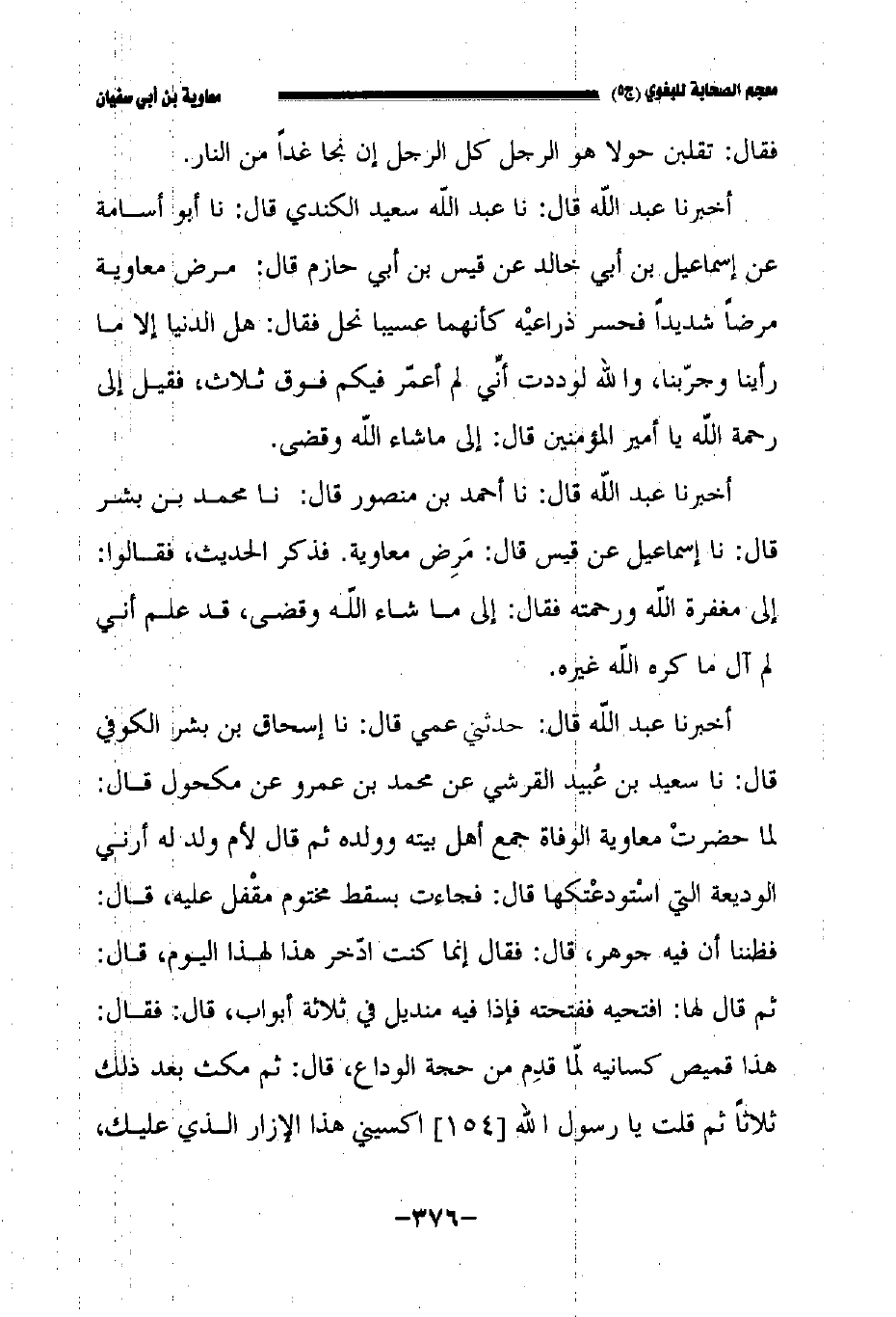 أخبرنا عبد الله قال: حدثني عمي قال: حدثنا إسحاق بن بشر الكوفي قال: حدثنا سعيد بن عبيد القرشي عن محمد بن عمرو عن مكحول قال لما حضرت معاوية الوفاة جمع أهل بنيه وولده ثم قال لأم ولد له أريني الوديعة التي استودعتكها، قال فجاءت بسقط مختوم مقفلا عليه قال فظننا أن فيه جوهرا قال فقال إنما كنت أدخر هذا لهذا اليوم قال ثم قال لها افتحيه ففتحته فإذا منديل عليه ثلاثة أثواب قال هذا قميص قال: فقال: هذا قميص كسانية لما قدم من حجة الوداع قال ثم مكث بعد ذلك ثلاثا ثم قلت يا رسول الله //١٥٤// اكسني هذا الإزار الذي عليك