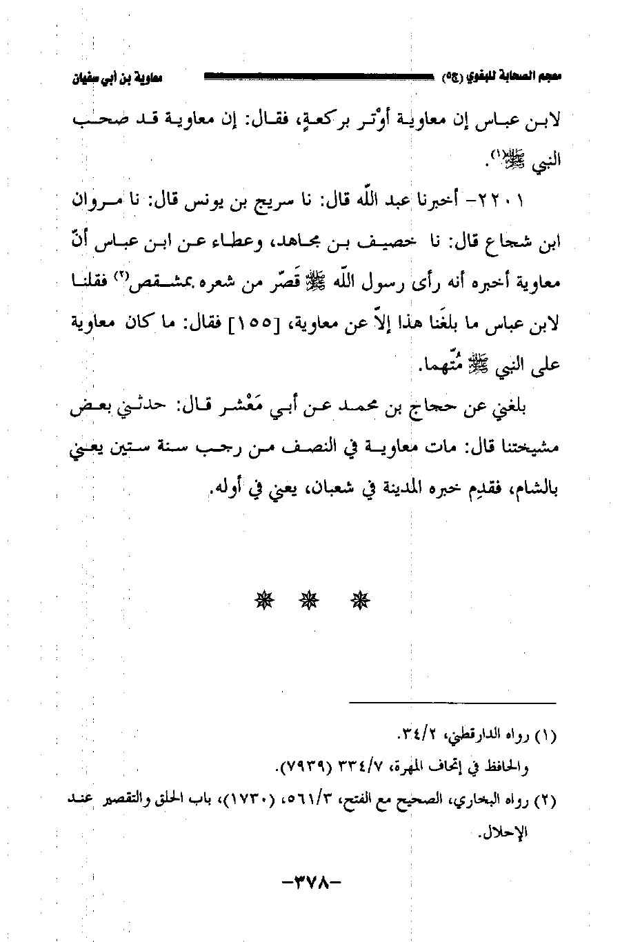 ٢٢٠١ - أخبرنا عبد الله قال: حدثنا سريج بن يونس قال: حدثنا مروان بن شجاع قال: حدثنا خصيف بن مجاهد وعطاء عن ابن عباس رضي الله عنه أن معاوية رضي الله عنه أخبره أنه رأى رسول الله صلى الله عليه وسلم قصر شعره بمشقص فقلنا لابن عباس ما بلغنا هذا إلا عن معاوية //١٥٥// فقال ما كان معاوية على النبي صلى الله عليه وسلم متهما.