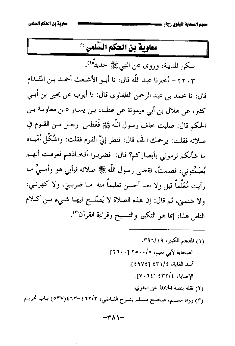 ٢٢٠٣ - أخبرنا عبد الله قال: حدثنا أبو الأشعث أحمد بن المقدام قال: حدثنا محمد بن عبد الرحمن الطفاوي قال: حدثنا أيوب عن يحيى بن أبي كثير عن هلال بن أبي ميمونة عَطَاء بن يسار عن معاوية بن الحكم قال صليت خلف رسول الله صلى الله عليه وسلم فعطس رجل من القوم في صلاته فقلت يرحمك الله قال فنظر إلي القوم فقلت واشكل أمياه ما شأنكم ترموني بأبصاركم قال فضربوا أفخاذهم فعرفت أنهم يصمتوني فصمت فقضى رسول الله صلى الله عليه وسلم صلاته فبأبي هو وأمي ما رأيت معلما قبل ولا بعد أحسن تعليما منه ما ضربني ولا كهرني ولا شتمني , ثم قال: إن هذه الصلاة لا يصلح فيها شيء من كلام الناس هذا إنما هو التكبير والتسبيح وقراءة القرآن.