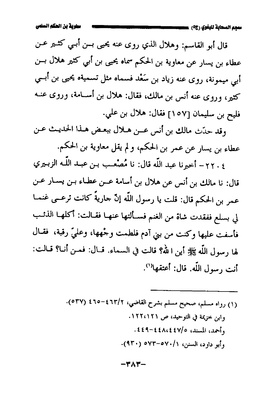 ٢٢٠٤ - أخبرنا عبد الله قال: حدثنا مصعب بن عبد الله الزبيري قال: حدثنا مالك بن أنس عن هلال بن أسامة عن عَطَاء بن يسار عن عمر بن الحكم قالقلت يا رسول الله إن جارية كانت ترعى غنما لي بسلع ففقدت شاة من الغنم فسألتها قفالت أكلها الذئب فأسفت عليها وكنت من بني آدم فلطمت وجهها وعلي رقبة فقال لها رسول الله صلى الله عليه وسلم أين الله قالت في السَّماء قال فمن أنا قالت أنت رسول الله صلى الله عليه وسلم قال: أعتقها.