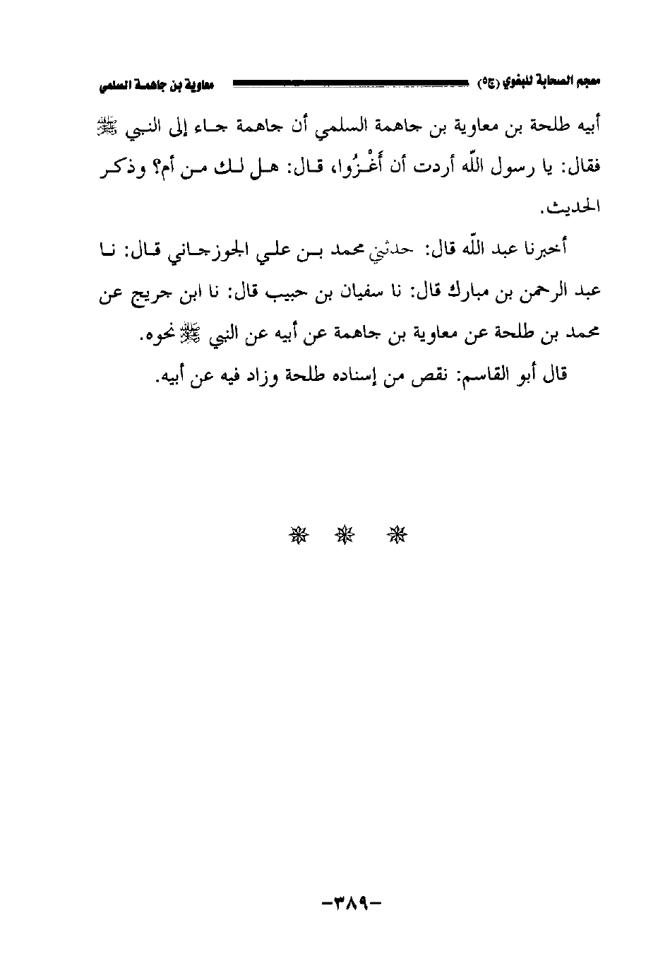 أخبرنا عبد الله قال: حدثني محمد بن علي الجوزجاني قال: حدثنا عبد الرحمن بن مبارك قال: حدثنا سفيان بن حبيب قال: حدثنا ابن جريج عن محمد بن طلحة عن معاوية بن جاهمة , عن أبيه عن النبي صلى الله عليه وسلم نحوه.