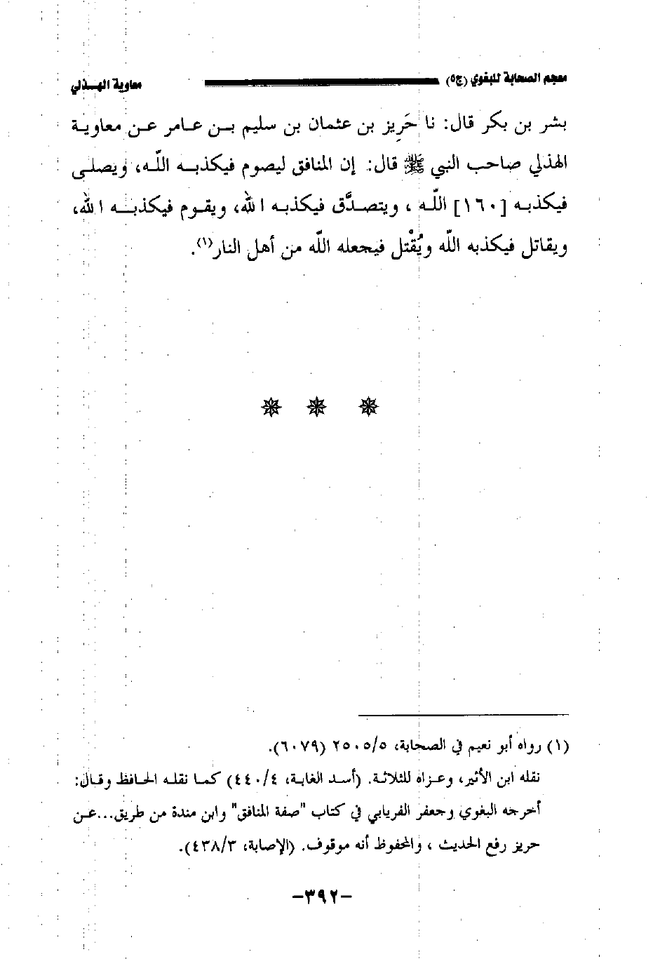 بشر بن بكر قال: حدثنا جرير بن عثمان بن سليم بن عامر عن معاوية الهذلي صاحب النبي صلى الله عليه وسلم قال: إن المنافق ليصوم فيكذبه الله عز وجل ويصلي فيكذبه //١٦٠//الله ويتصدق فيكذبه الله ويقوم فيكذبه الله ويقاتل فيكذبه الله ويقتل فيجعله الله من أهل النار.