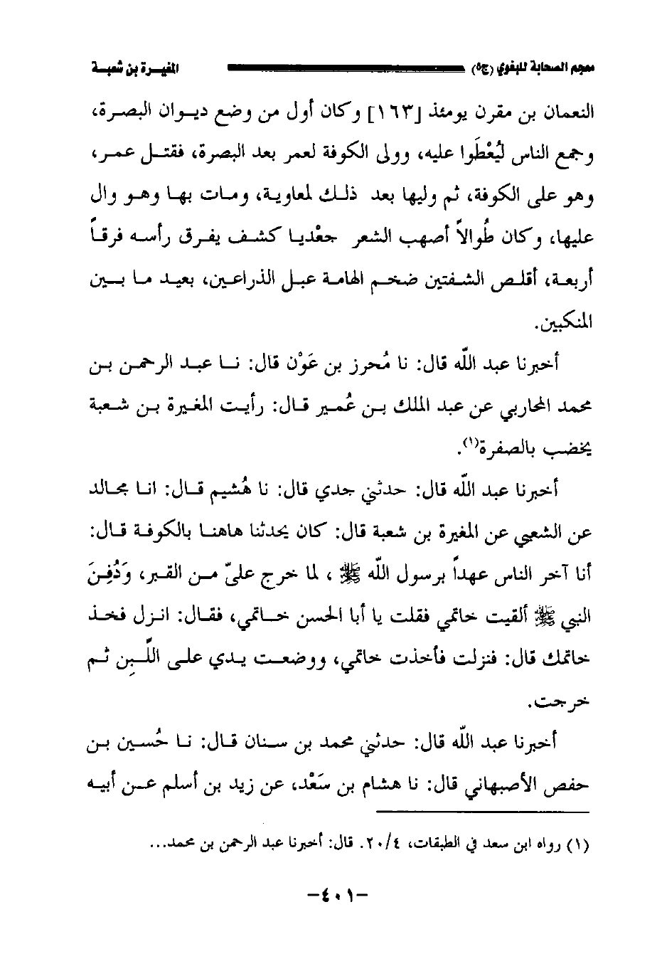 أخبرنا عبد الله قال: حدثنا محرز بن عون قال: حدثنا عبد الرحمن بن المحاربي عن عبد الملك بن عمير قال رأيت المغيرة بن شعبة يخضب بالصفرة.