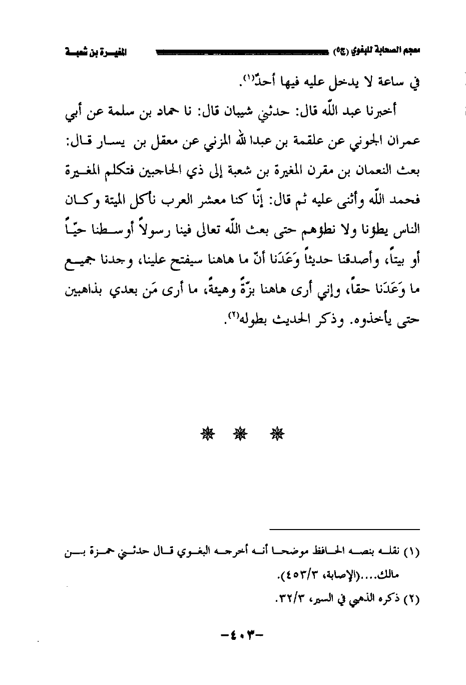 أخبرنا عبد الله قال: حدثني شيبان قال: حدثنا حماد بن سلمة عن أبي عمران الجوني عن علقمة بن عبد الله المزني عن معقل بن يسار قال بعث النعمان بن مقرن المغيرة بن شعبة إلى ذي الحاجبين فتكلم المغيرة فحمد الله وأثنى عليه , ثم قال: إنا كنا معشر العرب نأكل الميتة وكان الناس يطؤنا وأصدقنا حتى بعث الله تعالى فينا رسولا أوسطنا حيا أو بيتا وأصدقنا حديثا وعدنا أن ما هاهنا سيفتح علينا وجدنا جميع ما وعدنا حقا وإني أرى هاهنا بزة وهيئة ما أرى من بعدي بذاهبين حتى يأخذوه .. , وذكر الحديث بطوله.