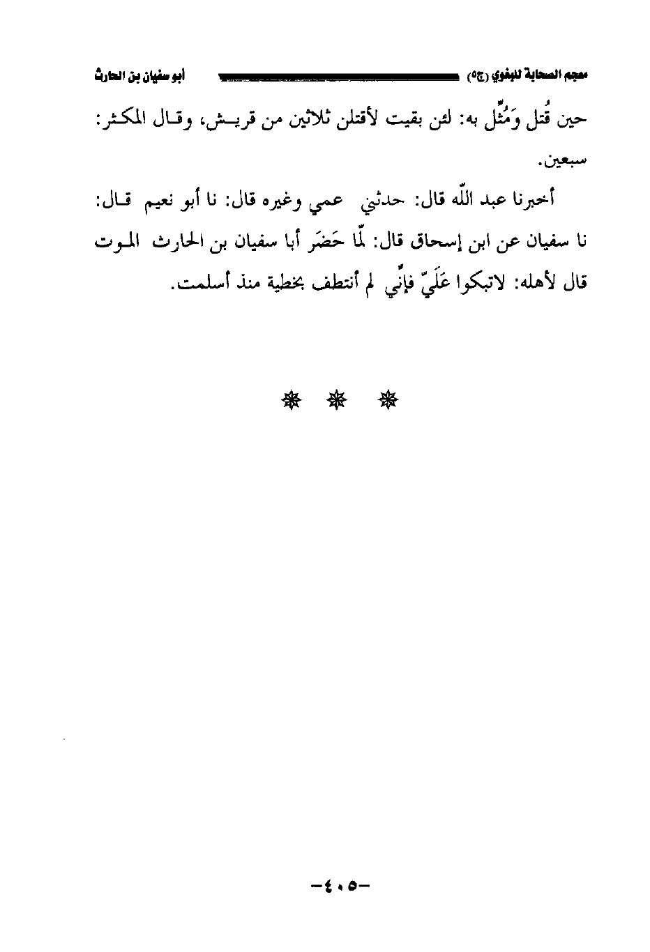أخبرنا عبد الله قال: حدثني عمي قال: حدثنا أبو نعيم قال: حدثنا سفيان عن ابن إسحاق قال لما حضر أبا سفيان بن الحارث الموتقال لأهله لا تبكوا علي فإني لم أنتطف بخطية منذ أسلمت.