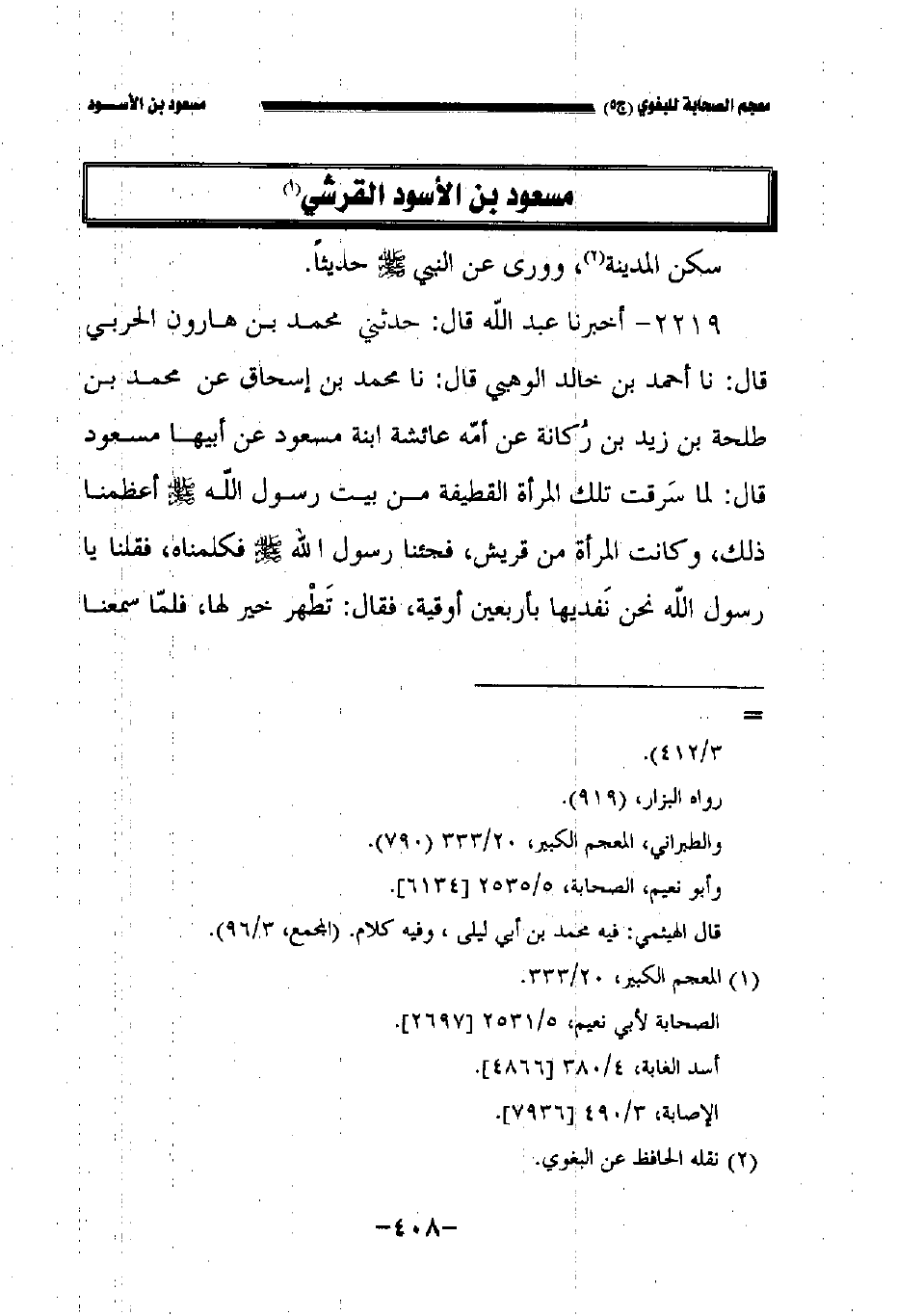 ٢٢١٩ - أخبرنا عبد الله قال: حدثني محمد بن هارون الحربي قال: حدثنا أحمد بن خالد الوهبي قال حدثنا محمد بن إسحاق عن محمد بن طلحة بن زيد بن ركانة عن أمه عائشة ابنة مسعود عن أبيها مسعود قال لما سرقت تلك المرأة القطيفة من بيت رسول الله صلى الله عليه وسلم أعظمنا ذلك وكانت المرأة من قريش فجئنا رسول الله صلى الله عليه وسلم فكلمناه فقلنا يا رسول الله نحن نفديها بأربعين أوقية فقال تطهر خير لها فلما سمعنا