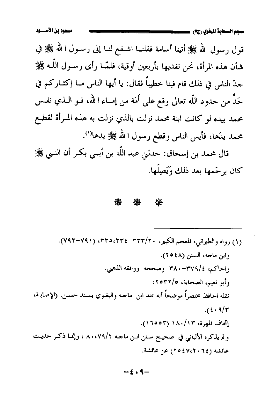 قول رسول الله صلى الله عليه وسلم أتينا أسامة فقلنا اشفع لنا إلى رسول الله صلى الله عليه وسلم في شأن هذه المرأة نحن نفديها بأربعين أوقية فلما رأى رسول الله صلى الله عليه وسلم جد الناس في ذلك قام فينا خطيبا فقال يا أيها الناس ما إكثاركم في حد من حدود الله تعالى وقع على أمة من إماء الله فوالذي نفس محمد بيده لو كانت ابنة محمد نزلت بالذي نزلت به هذه المرأة لقطع محمد يدها فأيس الناس وقطع رسول الله صلى الله عليه وسلم يدها.