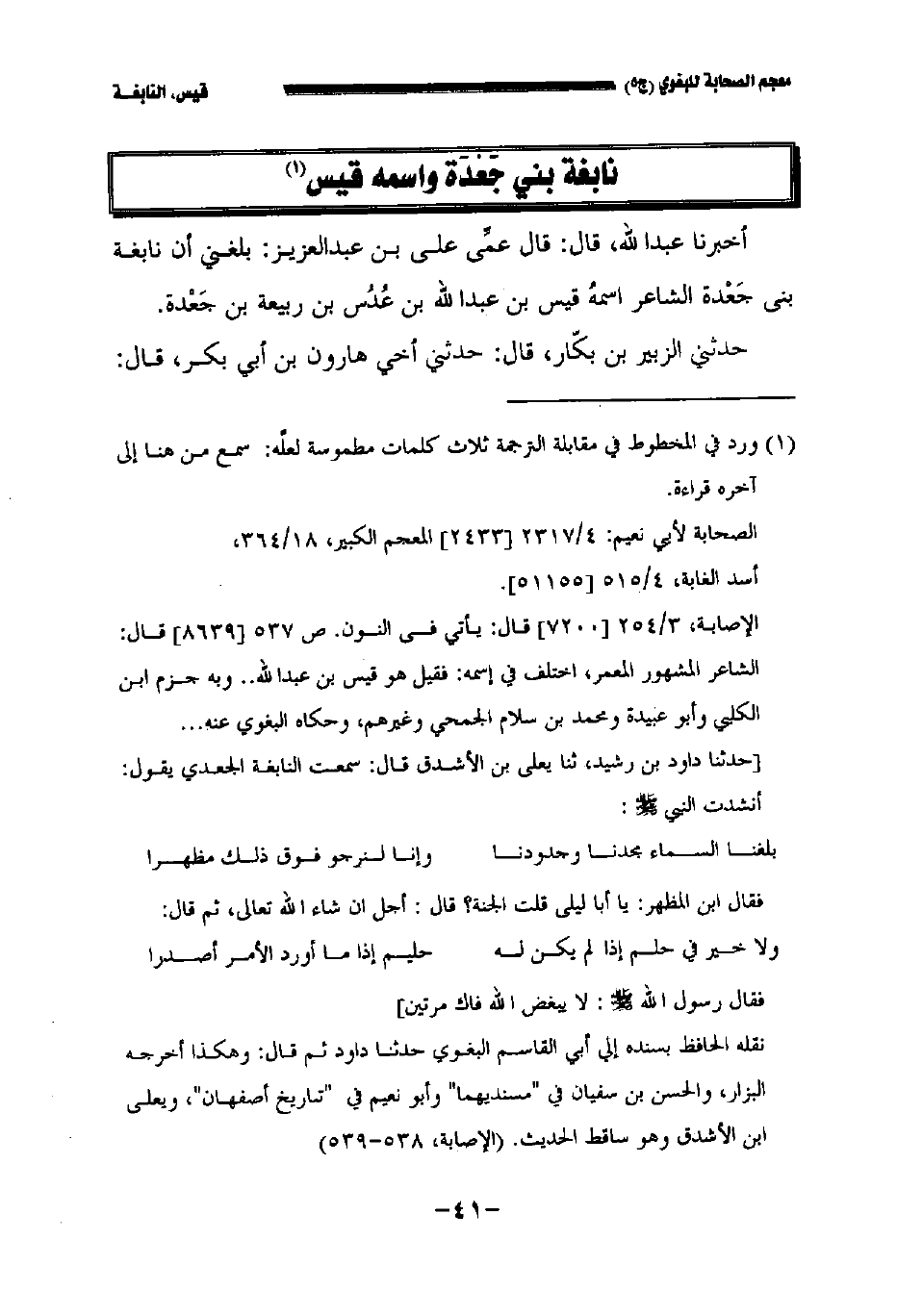 أخبرنا عبد الله قال: قال عمي علي بن عبد العزيز: بلغني أن نابغة بني جعدة الشاعر اسمه قيس بن عبد الله بن عدس بن ربيعة بن جعدة.