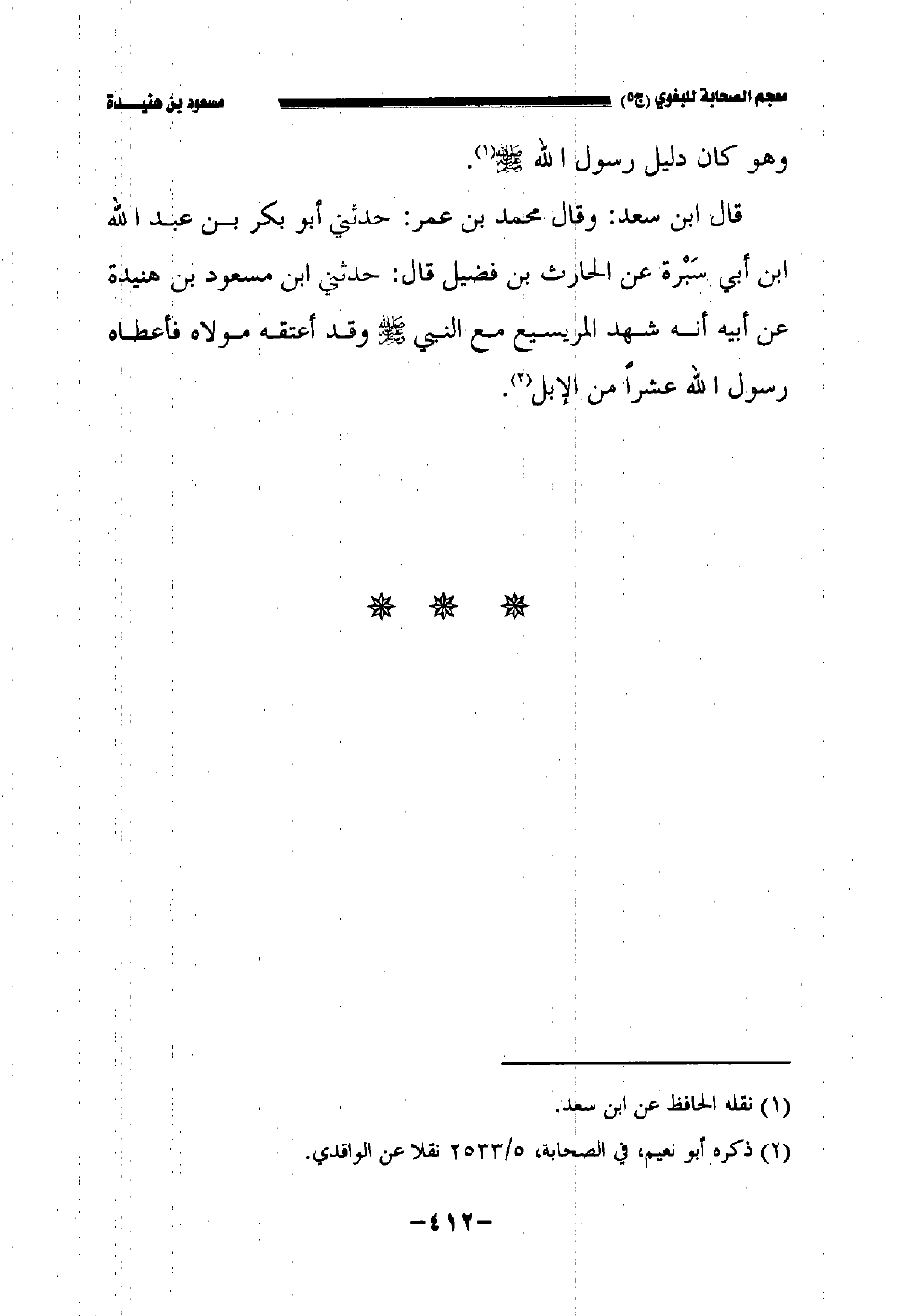 قال ابن عباس: وقال محمد بن عمر حدثني أبو بكر بن عبد الله بن أبي سبرة عن الحارث بن فضيل قال: حدثني ابن مسعود بن هنيدة , عن أبيه أنه شهد المريسيع مع النبي صلى الله عليه وسلم وقد أعتقه مولاه فأعطاه رسول الله صلى الله عليه وسلم عشرا من الإبل.