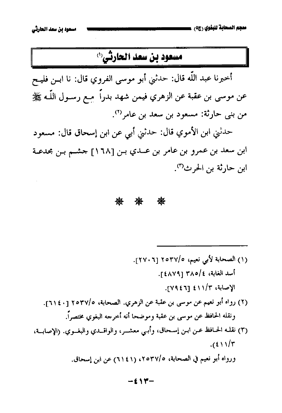 أخبرنا عبد الله قال: حدثني أبو موسى الفروي قال: حدثنا ابن فليح عن موسى بن عقبة عن الزهري فيمن شهد بدرا مع رسول الله صلى الله عليه وسلم من بني حارثة مسعود بن سعد بن عامر.