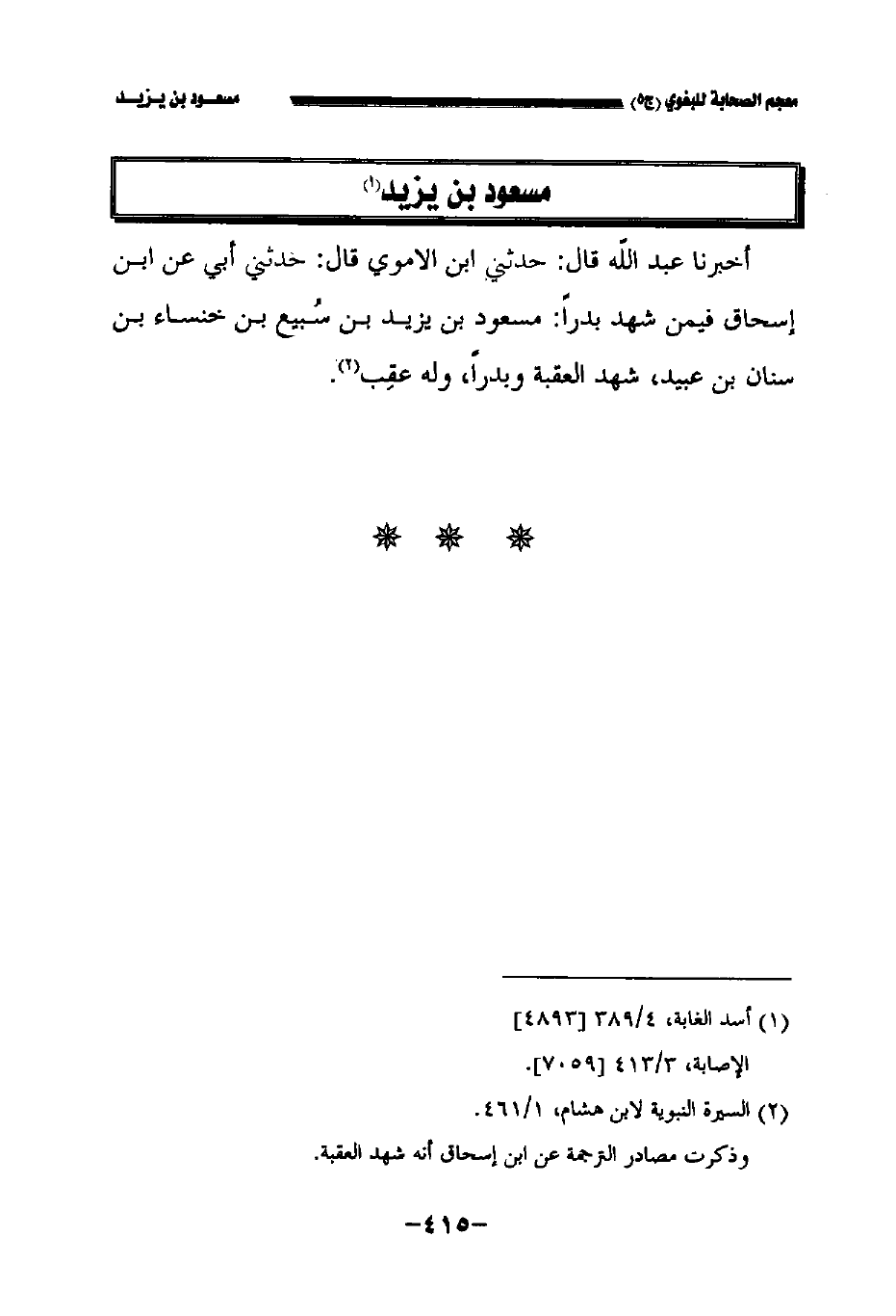 أخبرنا عبد الله قال: حدثني ابن الأموي قال: حدثني أبي عن ابن إسحاق فيمن شهد بدرا مسعود بن يزيد بن سبيع بن خنساء بن سنان بن عبيد شهد العقبة وبدرا وله عقب.