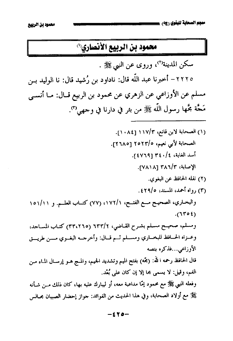 ٢٢٢٥ - أخبرنا عبد الله قال: حدثنا داود بن رشيد قال: حدثنا الوليد بن مسلم عن الأوزاعي عن الزهري عن محمود بن الربيع قال ما انسى مجة مجها رسول الله صلى الله عليه وسلم من بئر في دارنا في وجهي.