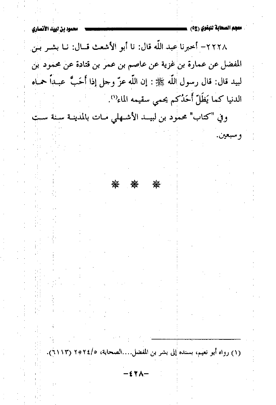 ٢٢٢٨ - أخبرنا عبد الله قال: حدثنا أبو الأشعث قال: حدثنا بشر بن المفضل عن عمارة بن غزية عن عاصم بن عمر عن قتادة عن محمود لبيد قال: قال رسول الله صلى الله عليه وسلم إن الله عز وجل إذا أحب عبدا حماه الدنيا كما يظل أحدكم يحمي سقيمه الماء.
