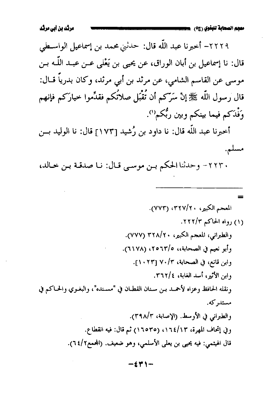 ٢٢٢٩ - أخبرنا عبد الله قال: حدثني محمد بن إسماعيل الواسطي قال: حدثنا إسماعيل بن أبان الوراق عن يحيى بن يعلى عن عبد الله بن موسى عن القاسم الشامي عن مرثد بن أبي مرثد وكان بدريا قال: قال رسول الله صلى الله عليه وسلم إن سركم أن تقبل صلاتكم فقدموا خياركم فإنهم وفدكم فيما بينكم وبين ربكم.