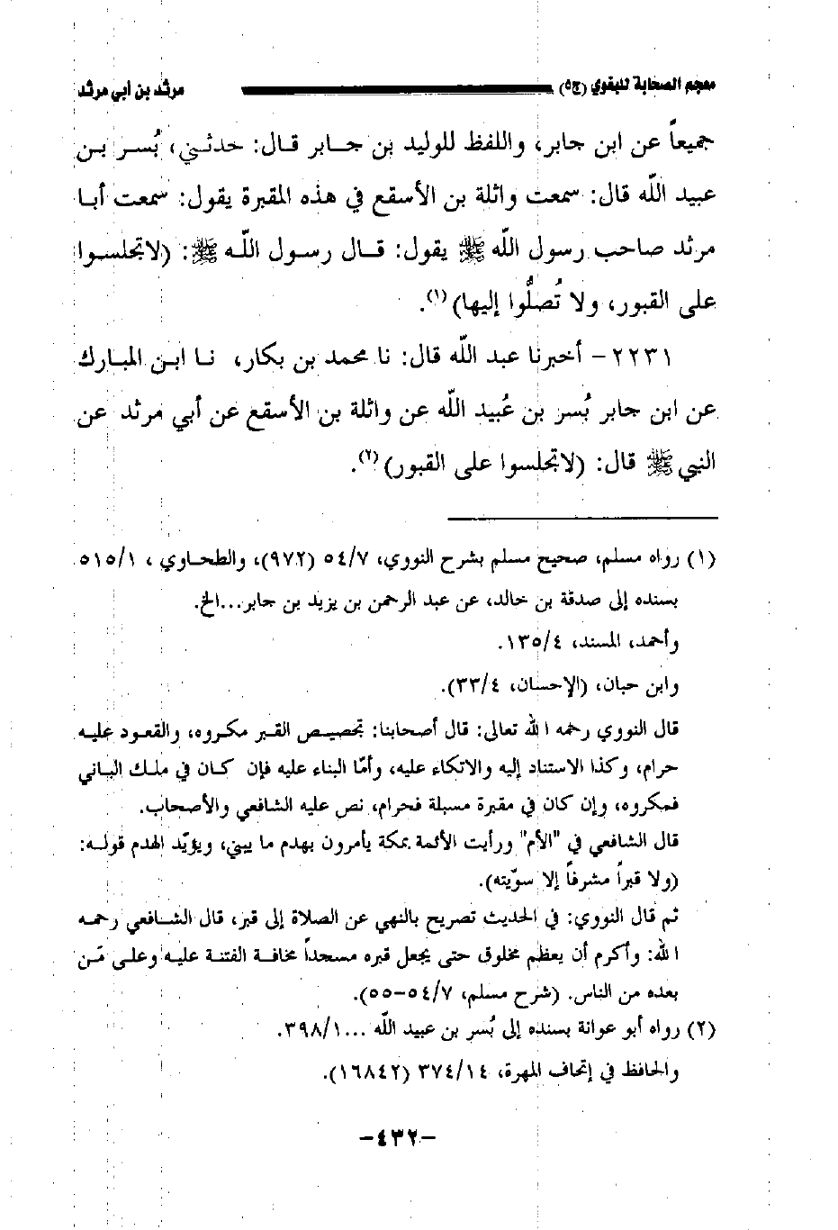 ٢٢٣١ - أخبرنا عبد الله قال: حدثنا محمد بن بكار حدثنا ابن المبارك عن ابن جابر بسر بن عبيد الله عن واثلة بن الأسقع عن مرثد عن النبي صلى الله عليه وسلم قال: لا تجلسوا على القبور.