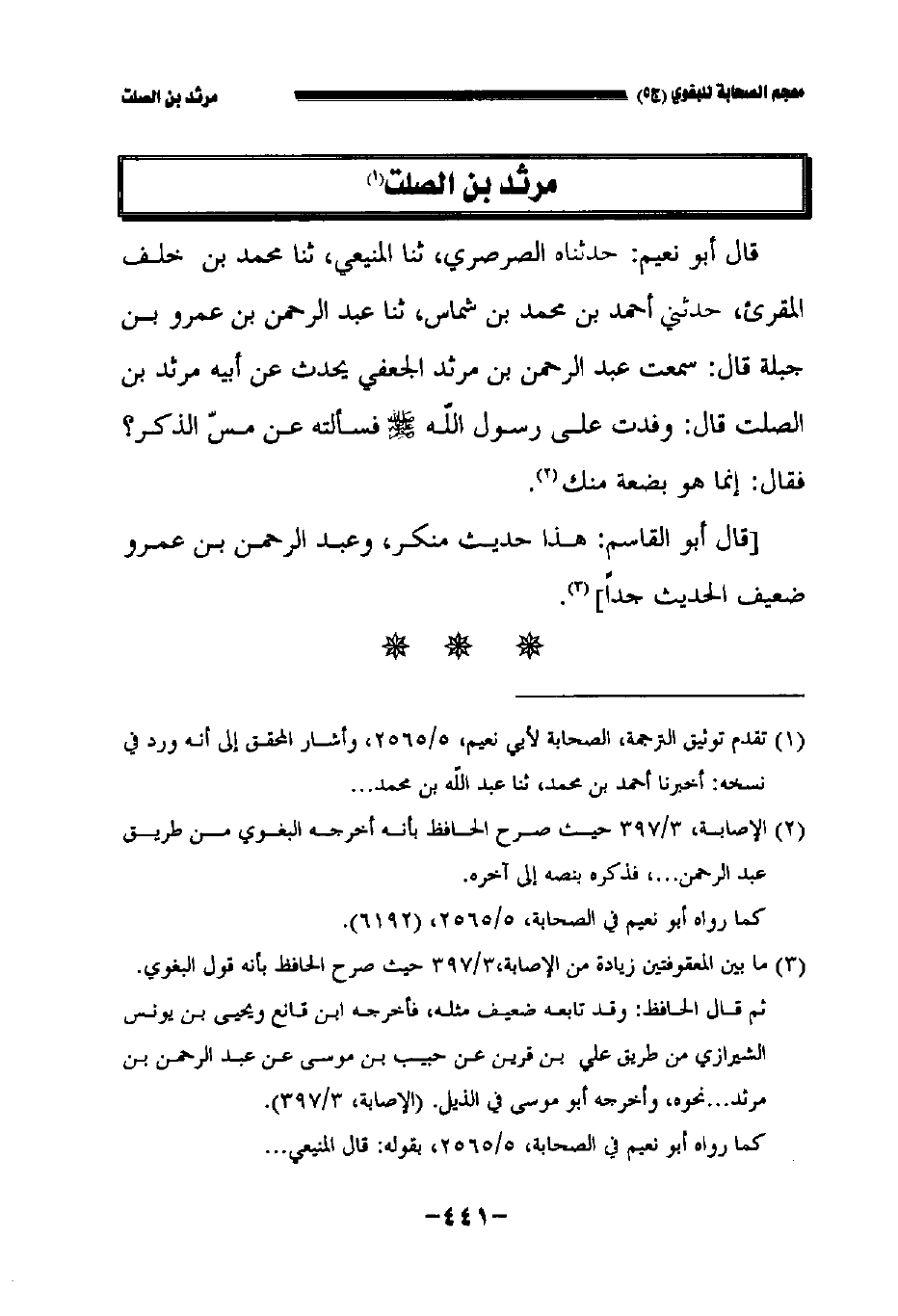 قال أبو نعيم حدثناه الصرصري حدثنا المنيعي حدثنا محمد بن خلف المقرئ حدثني أحمد بن محمد بن شماس حدثنا عبد الرحمن بن عمرو بن جبلة قال: سمعت عبد الرحمن بن مرثد الجعفي يحدث , عن أبيه مرثد بن الصلت قال وفدت على رسول الله صلى الله عليه وسلم فسألته عن مس الذكر فقال إنما هو بضعة منك.