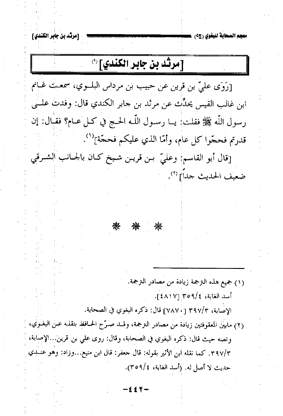 روى علي بن قرين عن حبيب بن مرداس البلوي سمعت غانم بن غالب القيس يحدث مرثد بن جابر الكندي قال وفدت على رسول الله صلى الله عليه وسلم فقلت يا رسول الله الحج في كل عام فقال إن قدرتم فحجوا كل عام وأما الذي عليكم فحجة.