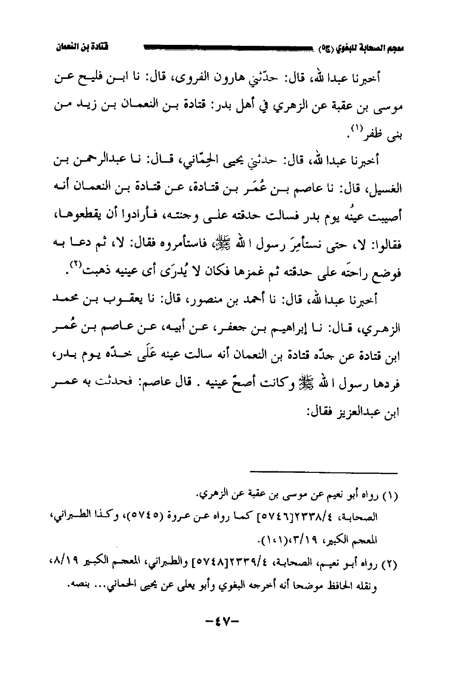أخبرنا عبد الله قال نا أحمد بن منصور قال نا يعقوب بن محمد الزهري قال نا إبراهيم بن جعفر عن أبيه عن عاصم بن عمر بن قتادة عن جده قتادة بن النعمان أنه سالت عينه على خده يوم بدر فردها رسول الله صلى الله عليه وسلم وكانت اصح عينيه. قال عاصم: فحدثت به عمر بن عبد العزيز فقال: