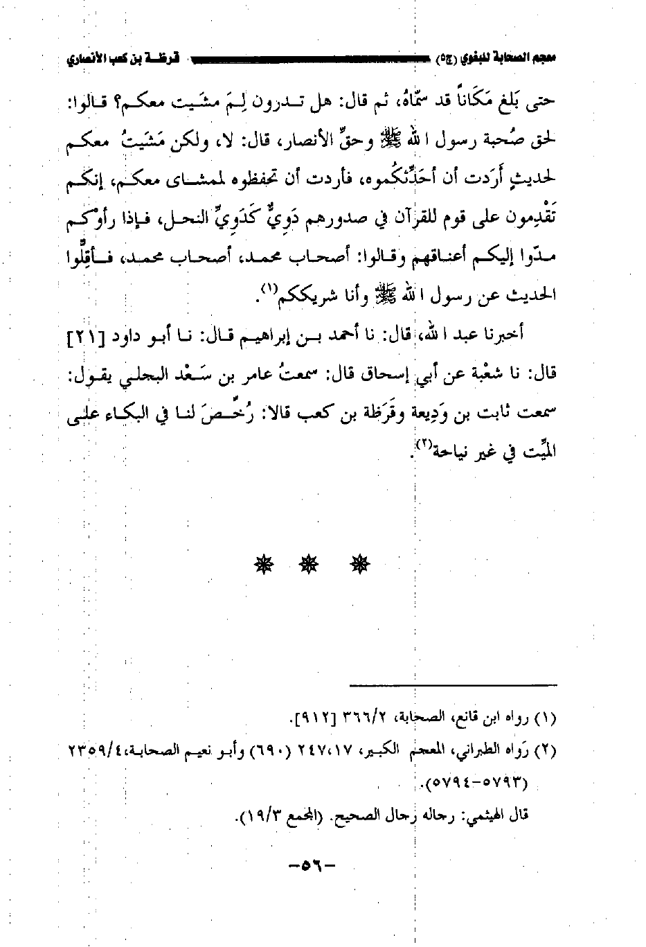 أخبرنا عبد الله نا أحمد بن إبراهيم قال نا أبو داود //٢١// قال نا شعبة عن أبي إسحاق قال سمعت عامر بن سعد البجلي يقول: سمعت ثابت بن وديعة وقرظة بن كعب قالا رخص لنا في البكاء على الميت في غير نياحة.