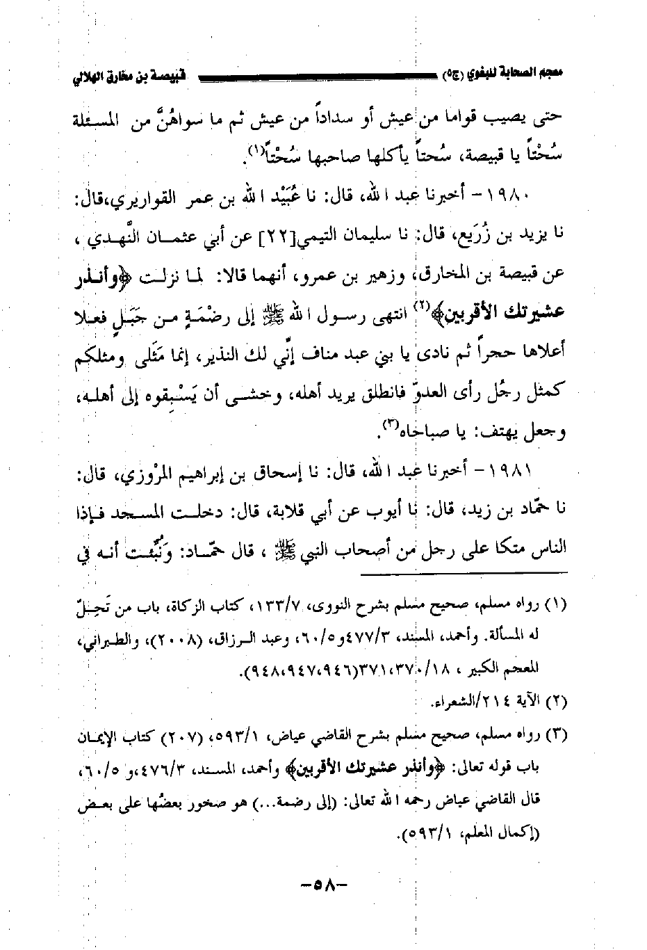 ١٩٨٠ - أخبرنا عبد الله قال: نا عبيد الله بن عمر القواريري قال نا يزيد بن زريع قال نا سليمان التيمي//٢٢// عن أبي عثمان النهدي عن قبيصة بن المخارق وزهير بن عمرو أنهما قالا: لما نزلت {وأنذر عشرتك الأقربين} انتهى رسول الله صلى الله عليه وسلم إلى رضمة من جبل فعلا أعلاها حجرا ثم نادى يا بني عبد مناف إني لك النذير إنما مثلي ومثلكم كمثل رجل رأى العدو فانطلق يريد أهله وخشى أن يسبقوه إلى أهله وجعل يهتف: يا صباحاه.