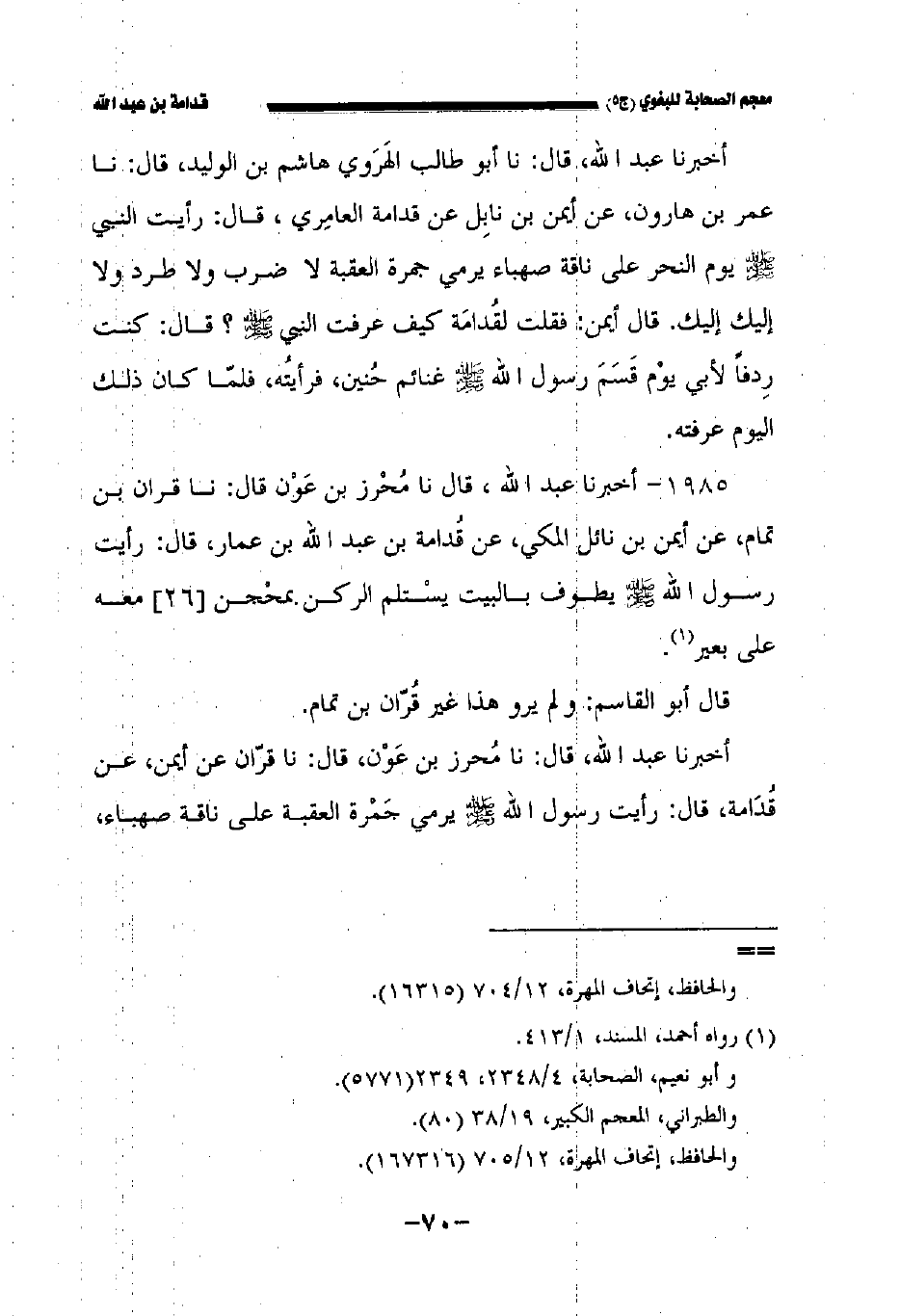 أخبرنا عبد الله قال: نا أبو طالب الهروي هاشم بن الوليد قال: نا عمر بن هارون عن أيمن بن نابل عن قدامة العامري قال: رأيت النبي صلى الله عليه وسلم يوم النحر على ناقة صهباء يرمي جمرة العقبة لا ضرب ولا طرد ولا إليك إليك. قال أيمن: فقلت لقدامة كيف عرفت النبي صلى الله عليه وسلم؟ قال: كنت ردفا لأبي يوم قسم رسول الله صلى الله عليه وسلم غنائم حنين فرأيته فلما كان ذلك اليوم عرفته.