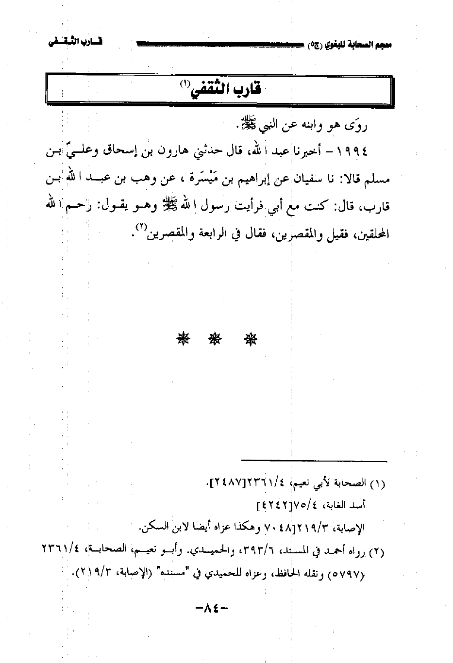 ١٩٩٤ - أخبرنا عبد الله قال حدثني هارون بن إسحاق وعلي بن مسلم قالا: نا سفيان عن إبراهيم بن ميسرة عن وهب بن عبد الله بن قارب قال: كنت مع أبي فرأيت رسول الله صلى الله عليه وسلم وهو يقول: رحم الله المحلقين فقيل والمقصرين فقال في الرابعة والمقصرين.