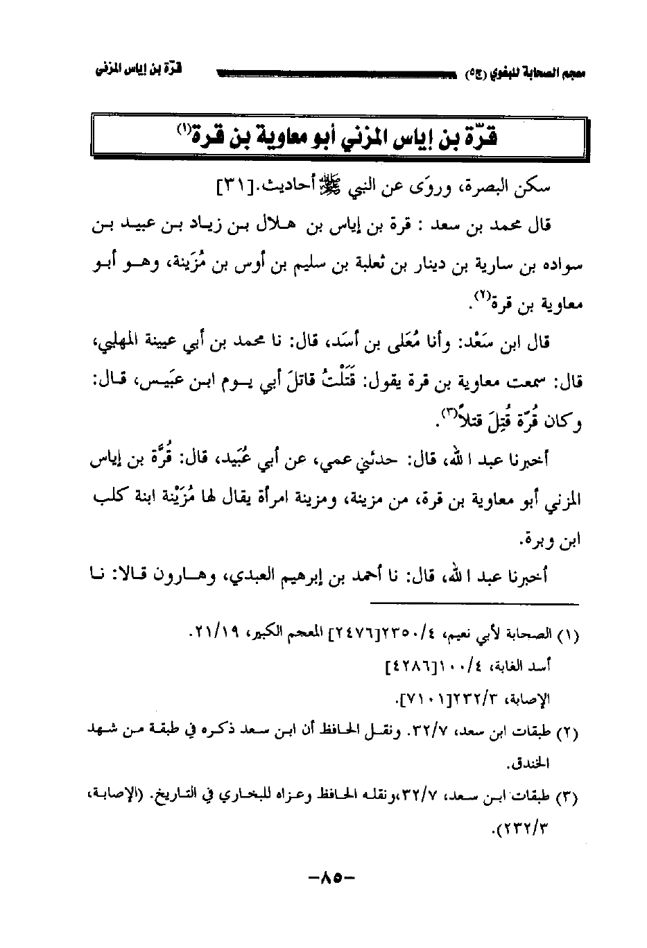 أخبرنا عبد الله قال حدثني عمي عن أبي عبيد قال قرة بن إياس المزني أبو معاوية بن قرة من مزينة ومزينة امرأة يقال لها مزينة ابنة كلب ابن وبرة.