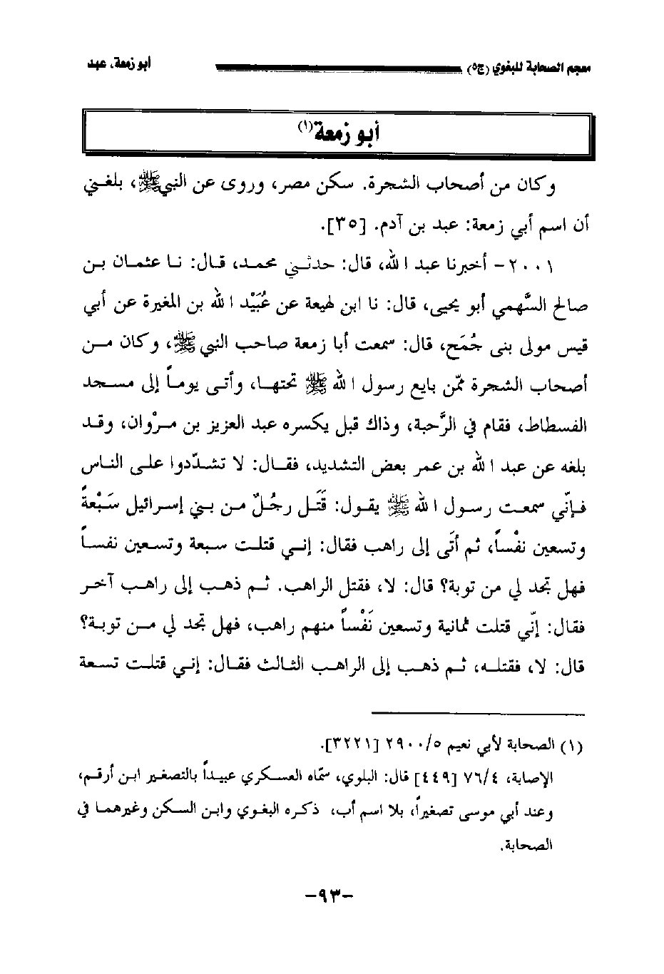 ٢٠٠١ - أخبرنا عبد الله قال حدثني محمد قال نا عثمان بن صالح السهمي أبو يحيى قال نا ابن لهيعة عن عبيد الله بن المغيرة عن أبي قيس مولى بني جمح قال سمعت أبا زمعة صاحب النبي صلى الله عليه وسلم وكان من أصحاب الشجرة ممن بايع رسول الله صلى الله عليه وسلم تحتها وأتى يوما إلى مسجد الفسطاط فقام في الرحبة وذاك قبل يكسره عبد العزيز بن مروان وقد بلغه عن عبد الله بن عمر بعض التشديد فقال: لا تشددوا على الناس فإني سمعت رسول الله صلى الله عليه وسلم يقول: قتل رجل من بني إسرائيل سبعة وتسعين نفسا ثم أتى إلى راهب فقال: إني قتلت سبعة وتسعين نفسا فهل تجد لي من توبة؟ قال: لا فقتل الراهب ثم ذهب إلى راهب آخر فقال: إني قتلت ثمانية وتسعين نفسا منهم راهب فهل تجد لي من توبة؟ قال: لا فقتله ثم ذهب إلى الراهب الثالث فقال: غني قتلت تسعة