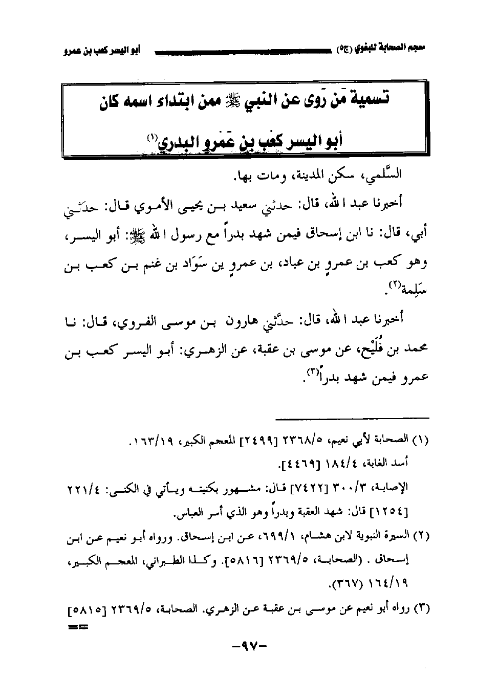 أخبرنا عبد الله قال: حدثني سعيد بن يحيى الأموي قال حدثني أبي قال: نا ابن إسحاق فيمن شهد بدرا مع رسول الله صلى الله عليه وسلم: أبو اليسر وهو كعب بن عمرو بن عباد بن عمرو بن سواد بن غنم بن كعب بن سلمة.
